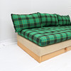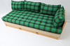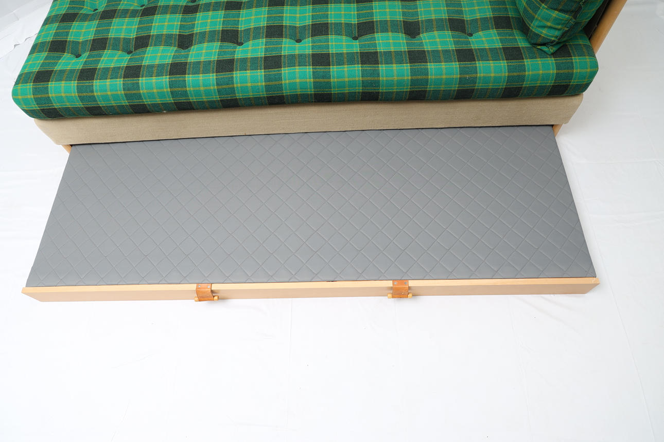 Beech with linen canvas. Loose button-tufted textile cushions. Pull-out bed section.