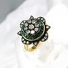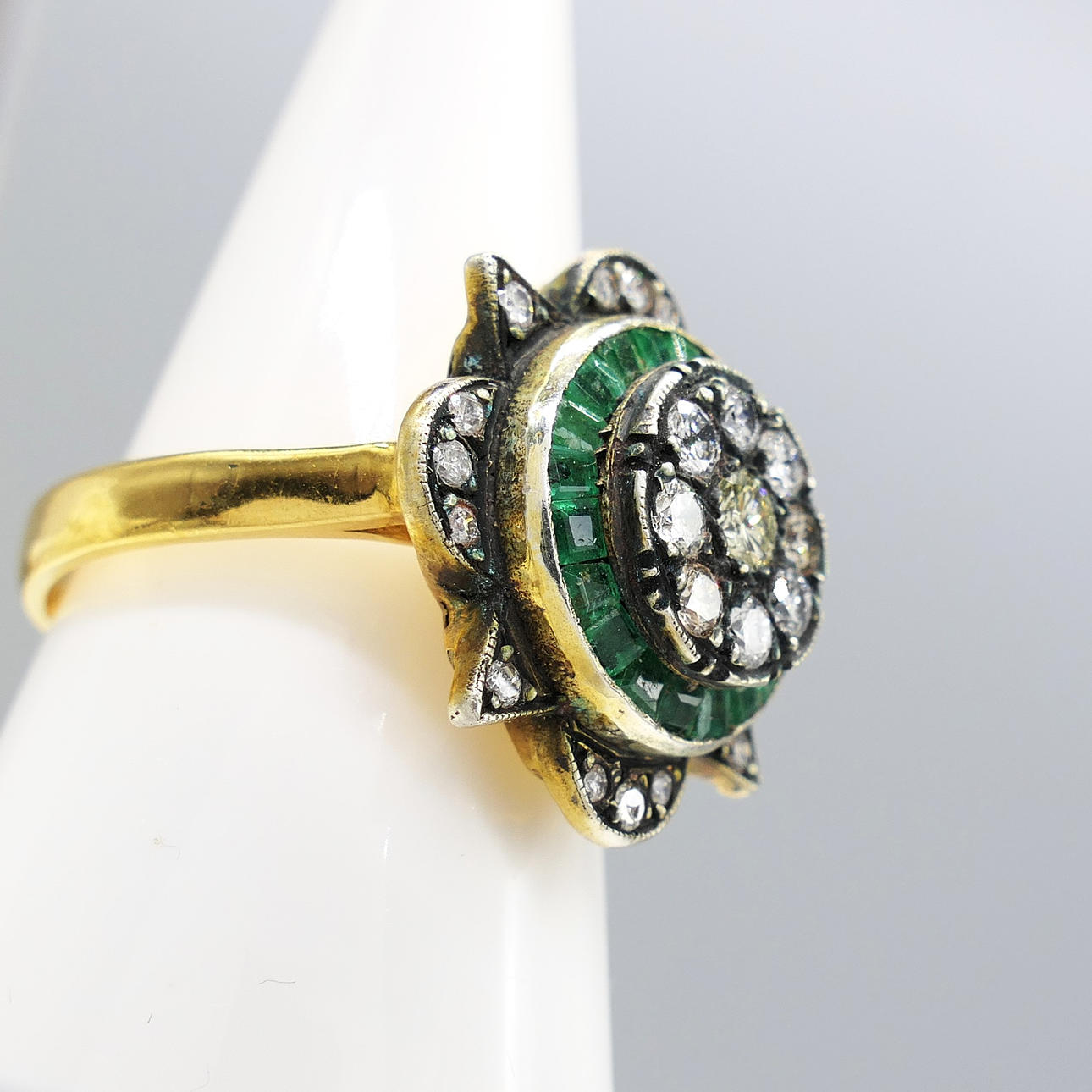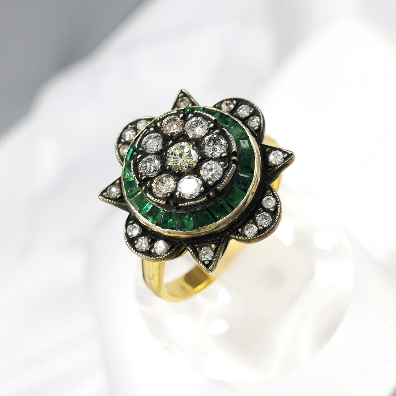 A Victorian style hand-made yellow gold ring set with emeralds and diamonds, with gift box