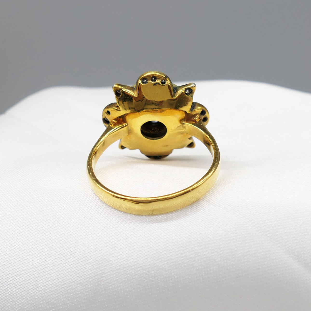 Ring: 8k yellow gold as tested, unhallmarked; ring head measures 18mm diameter; weight 7.2 grams