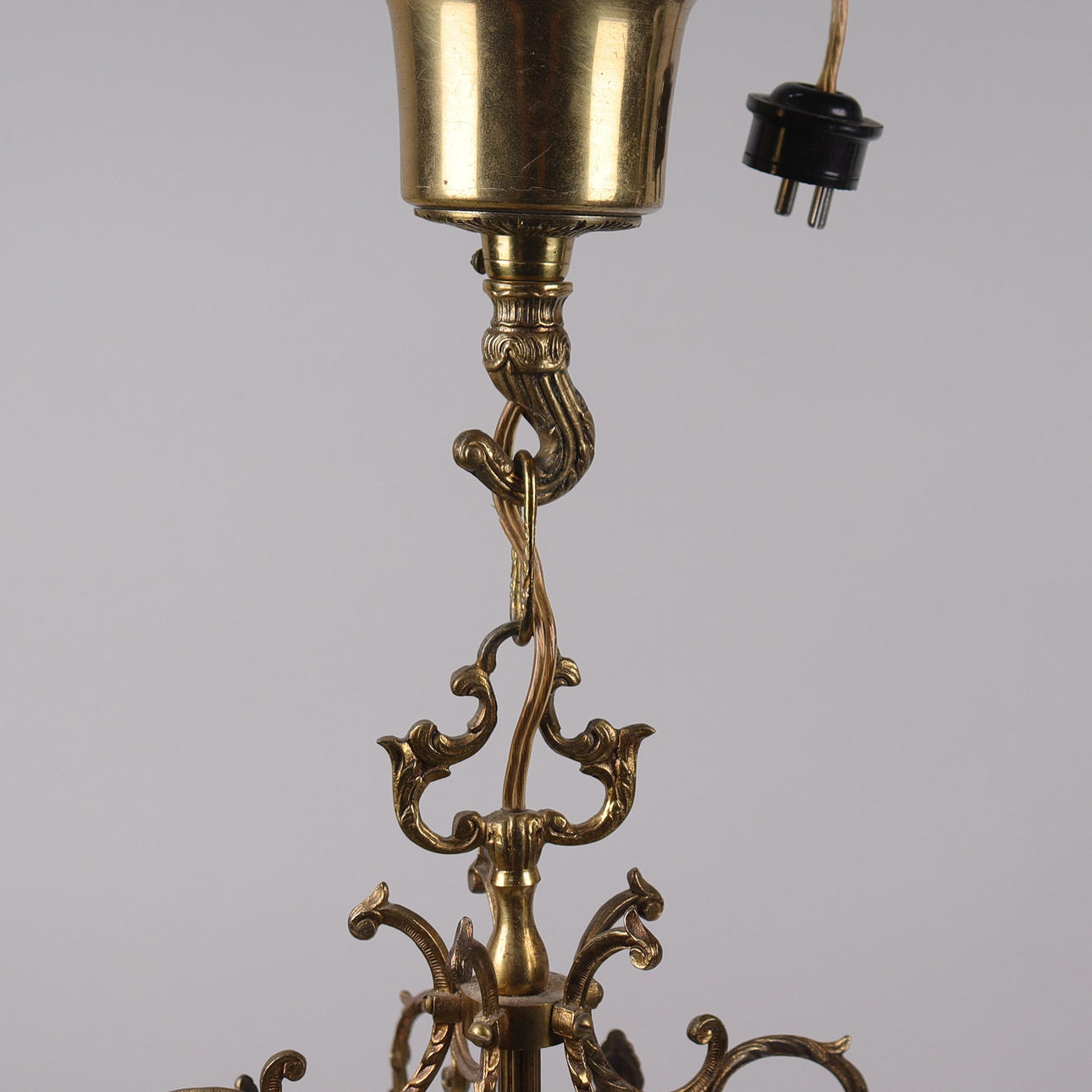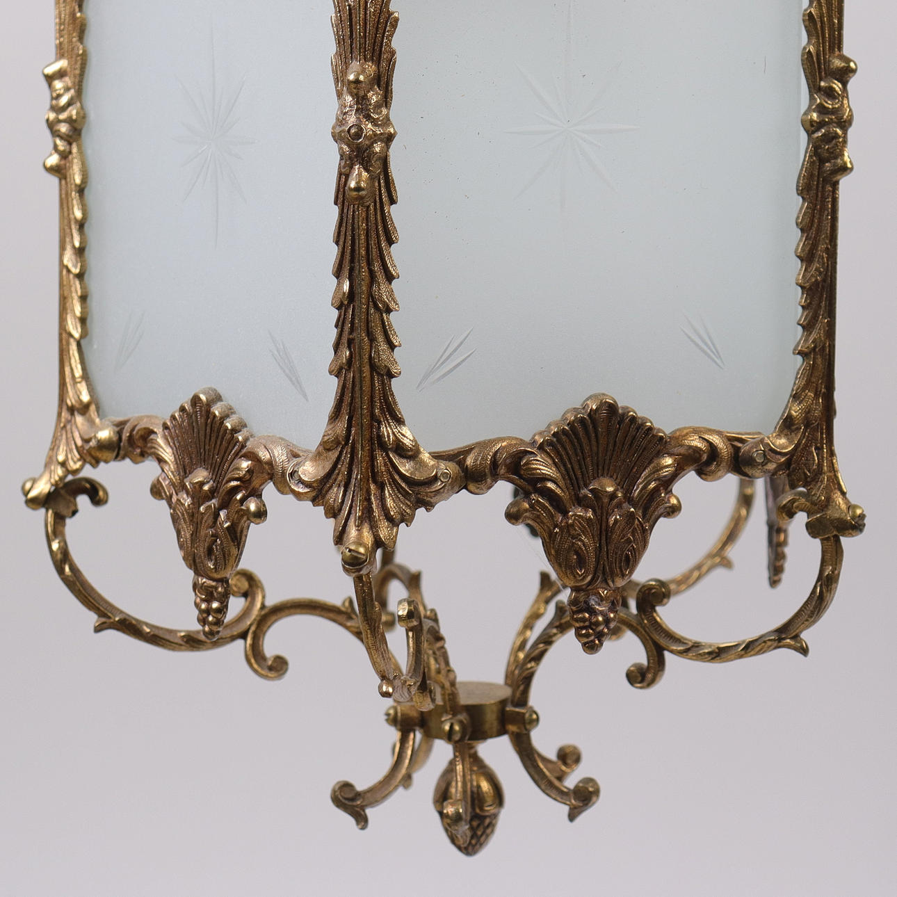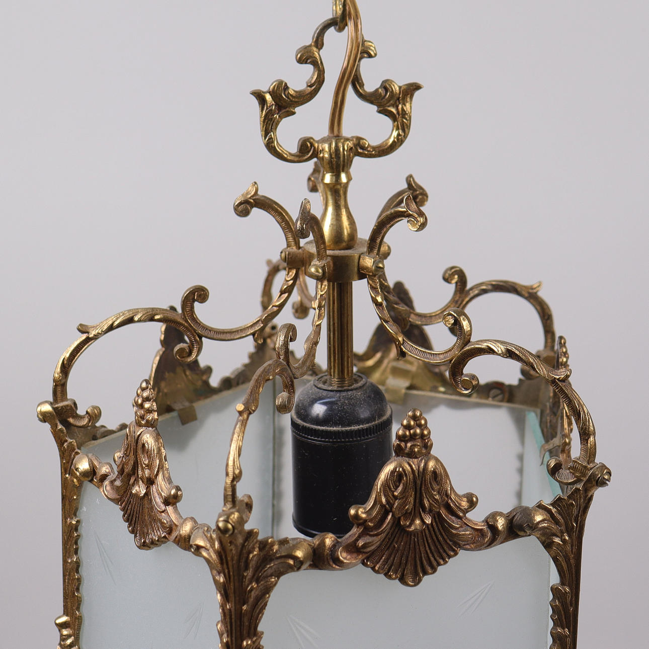 Brass frame, glass with decoration. Height including ceiling cup approx. 59 cm.