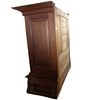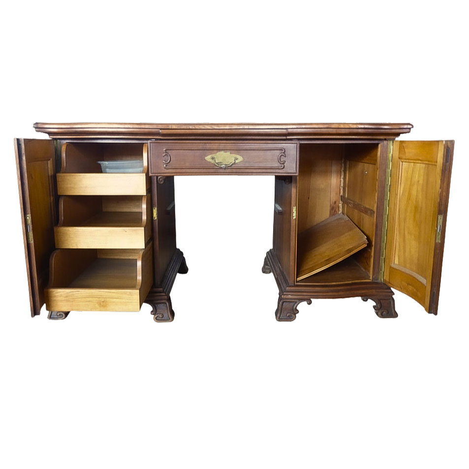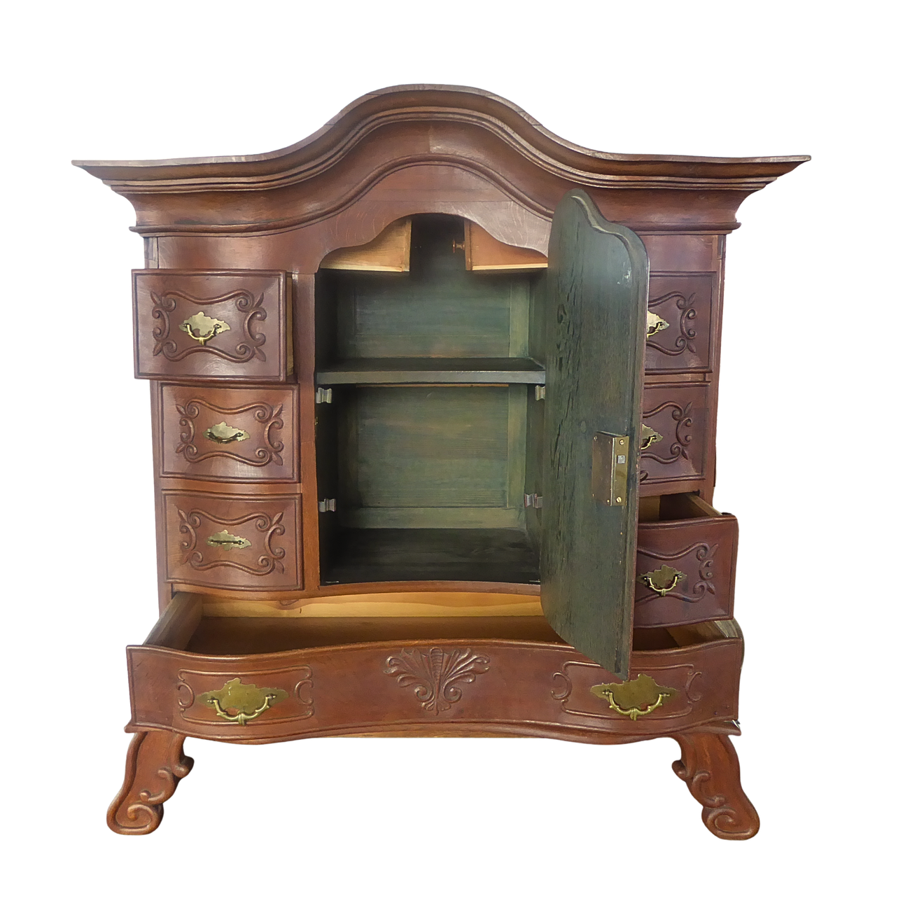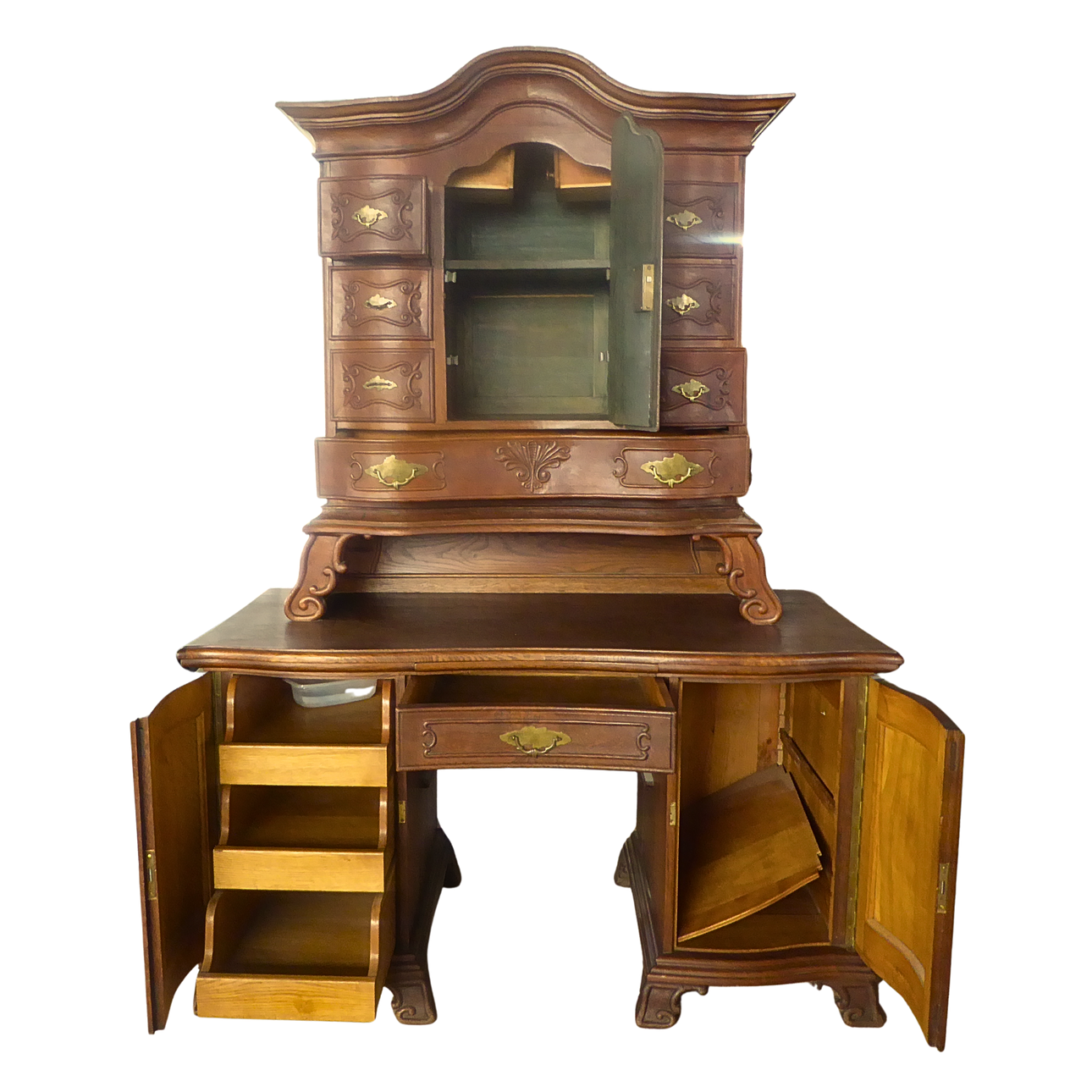 Two-part writing cabinet with a three-drawer, bombe commode base and a tabernacle top section with a central door. The carcass is crafted in solid oak and walnut and features period-typical secret compartments in the top section.