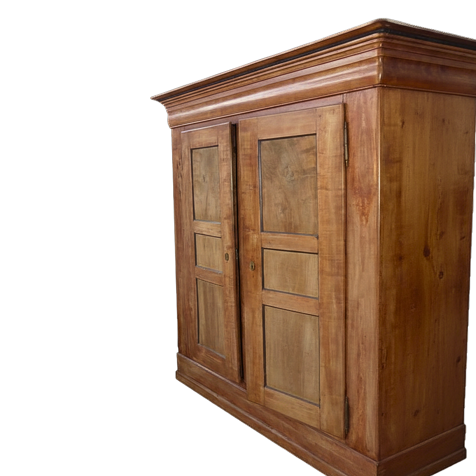 Two-door wardrobe in frame and panel construction, crafted from cherry wood. The interior is left in its original state and is equipped with a clothes rail.