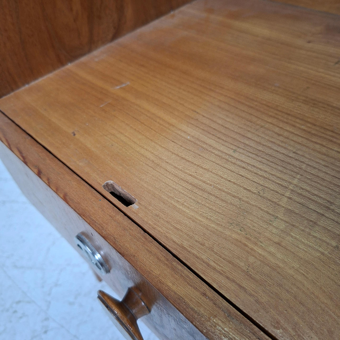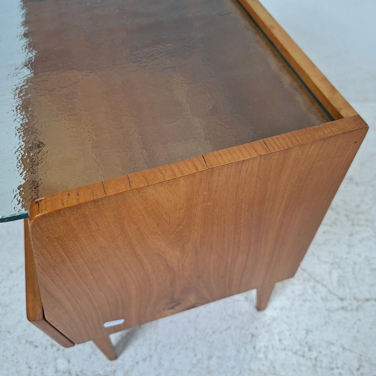 Elm, glass top, drawer.