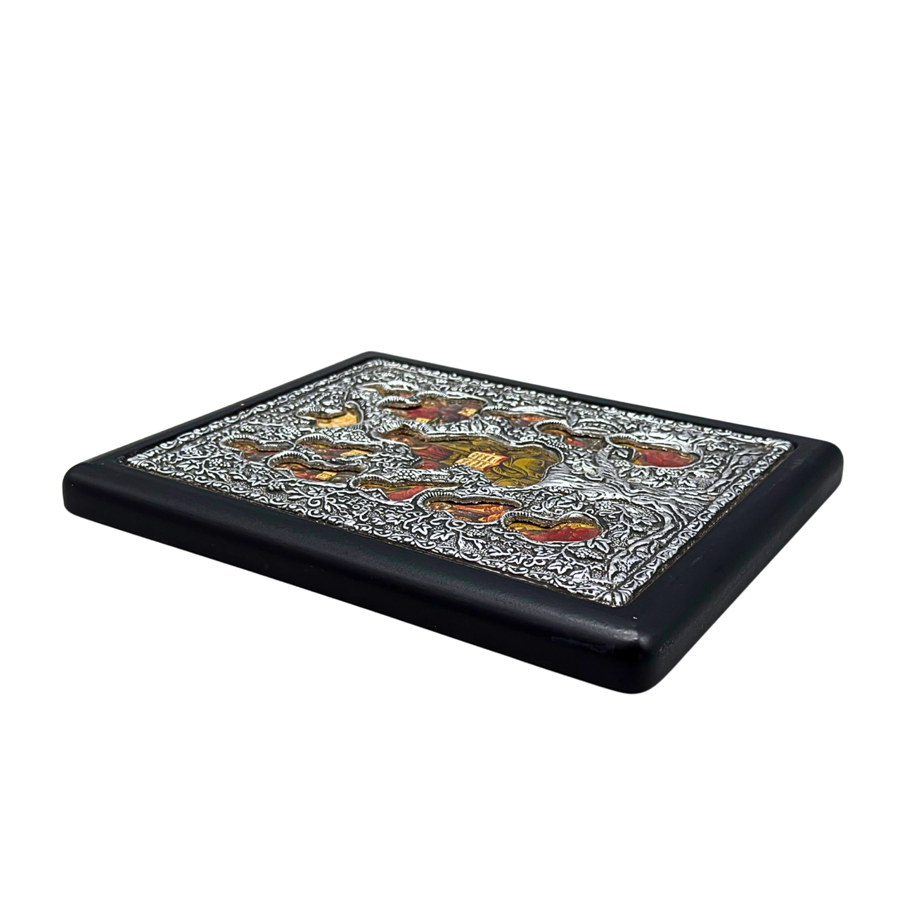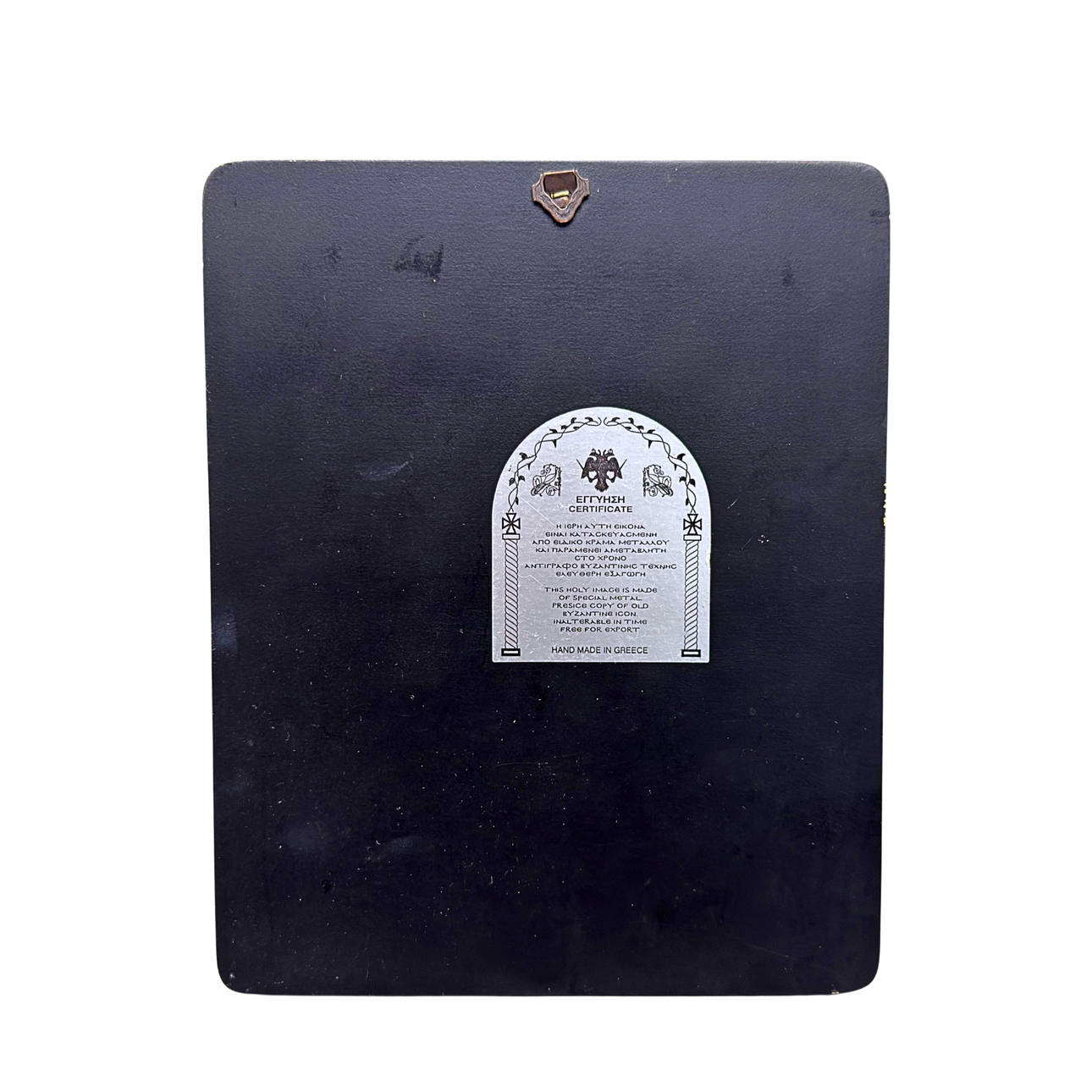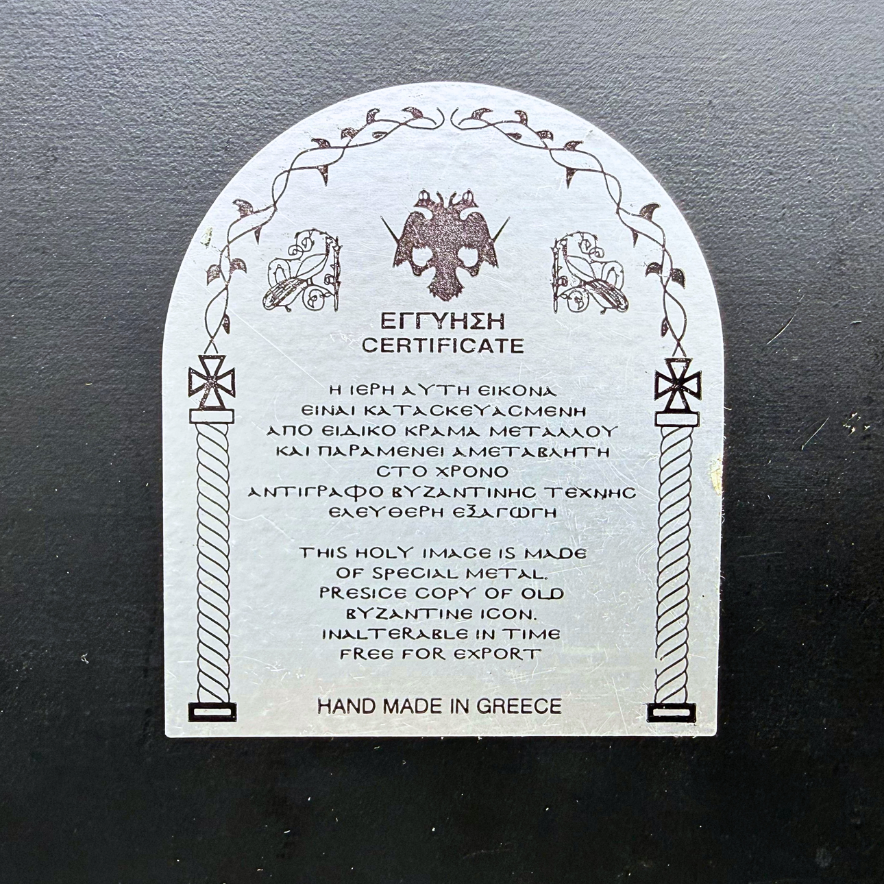 An icon crafted from a special metal alloy. Hand-worked in Greece. A certificate of authenticity is located on the reverse. The icon is a detailed reproduction of an old Byzantine icon.