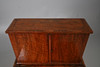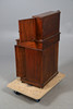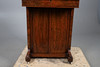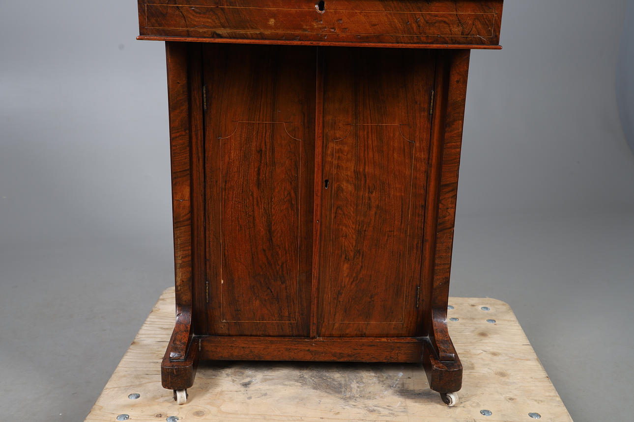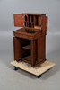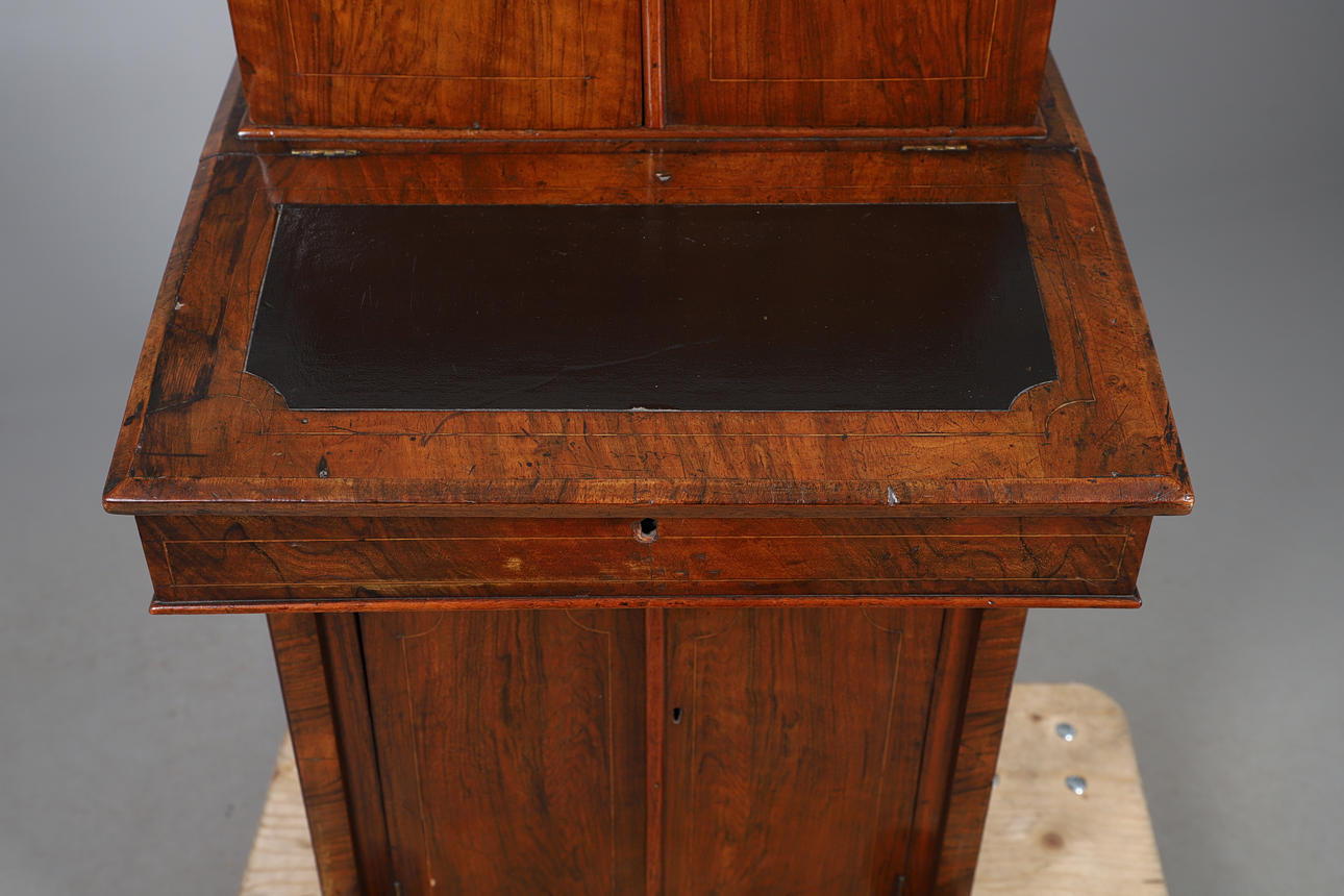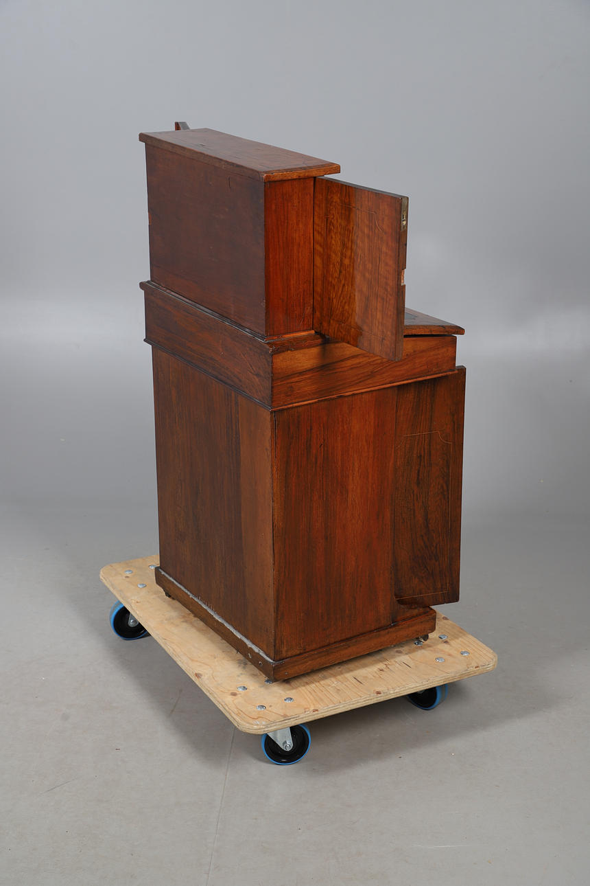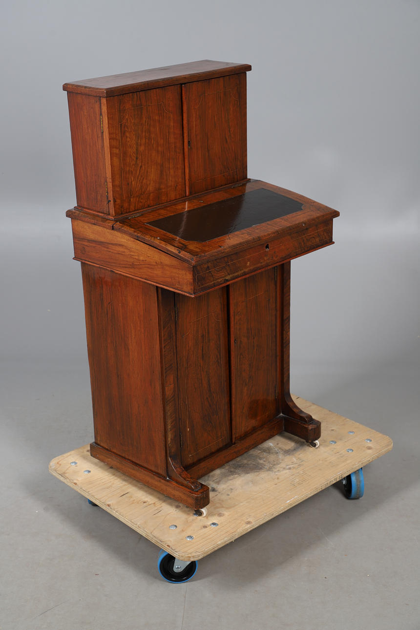 A 19th century walnut davenport, with a pop-up two door cabinet revealing 8 pigeon holes, above a hinged leather inset bowed writing surface, and raised on ceramic casters. 101.5cm (h) x 53cm (w) x 44cm (d).