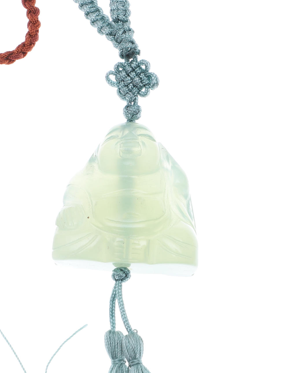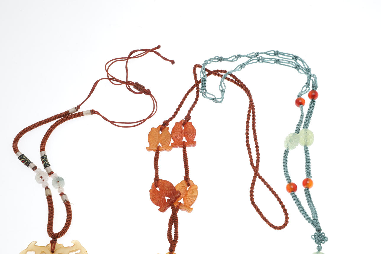 two carved brown hued jade pendants one of a bat and one depicting fish, together with a green stone Buddha pendant, all on knotted silk cords.