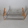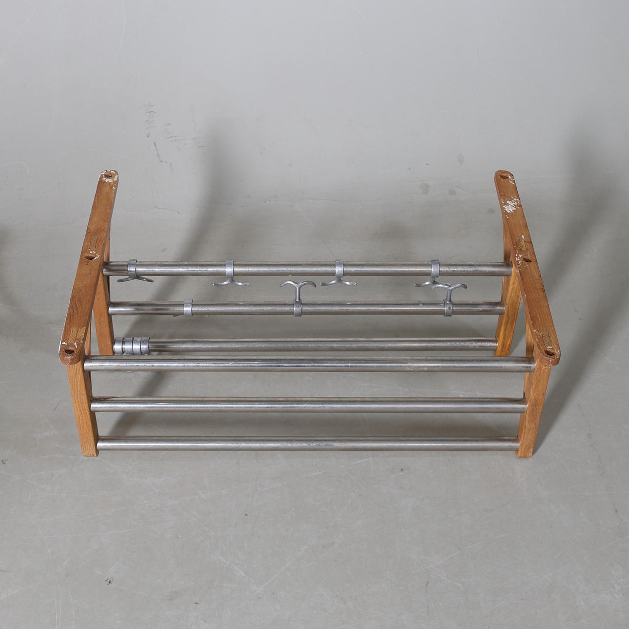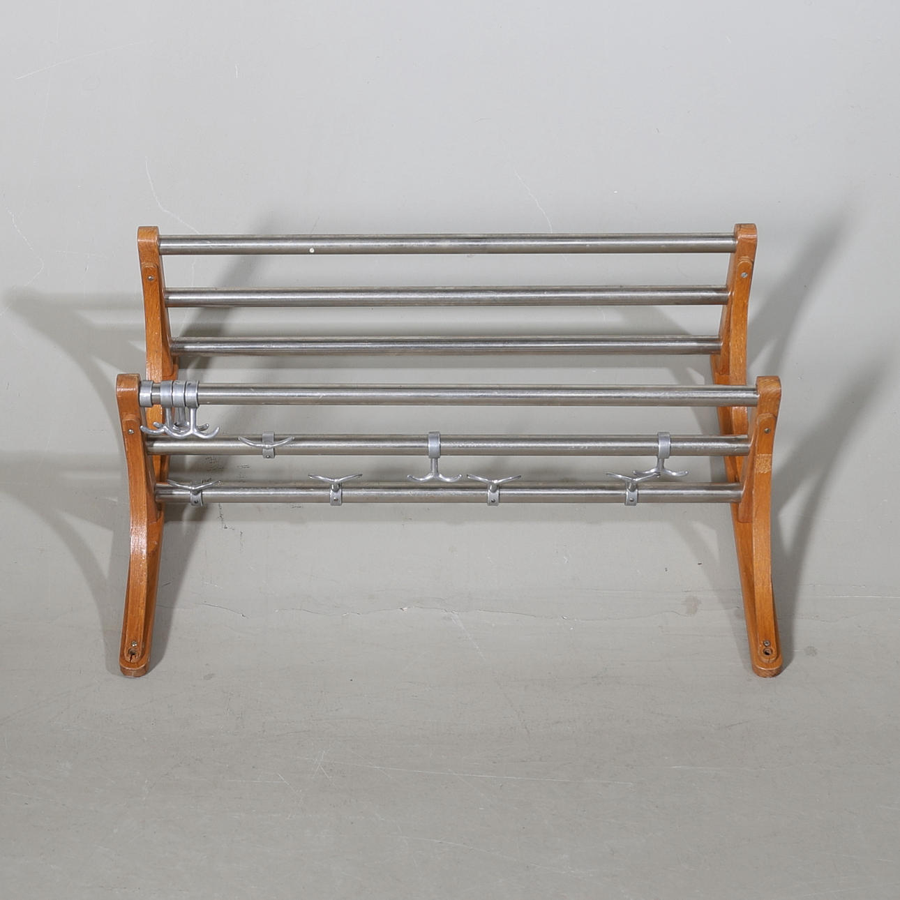 Two shelves. The lower one with adjustable hooks.