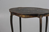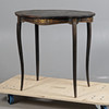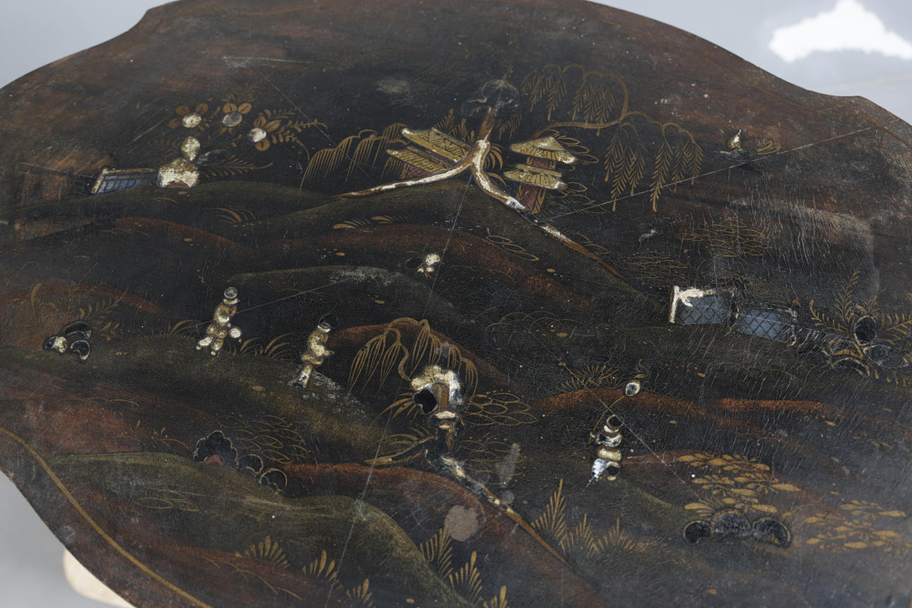 The shaped top with figures and pagodas in a landscape, raised on slender legs, 81 cm wide, 74 cm high.
