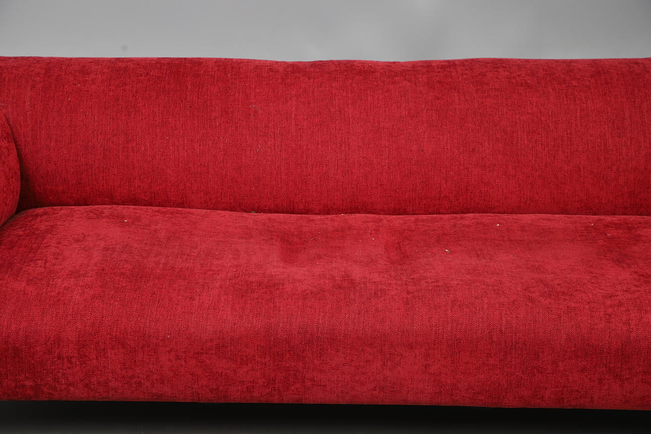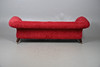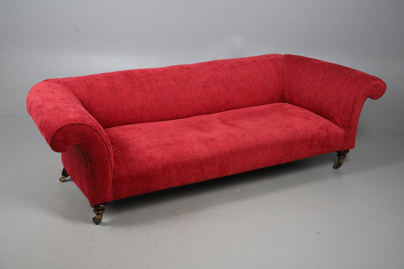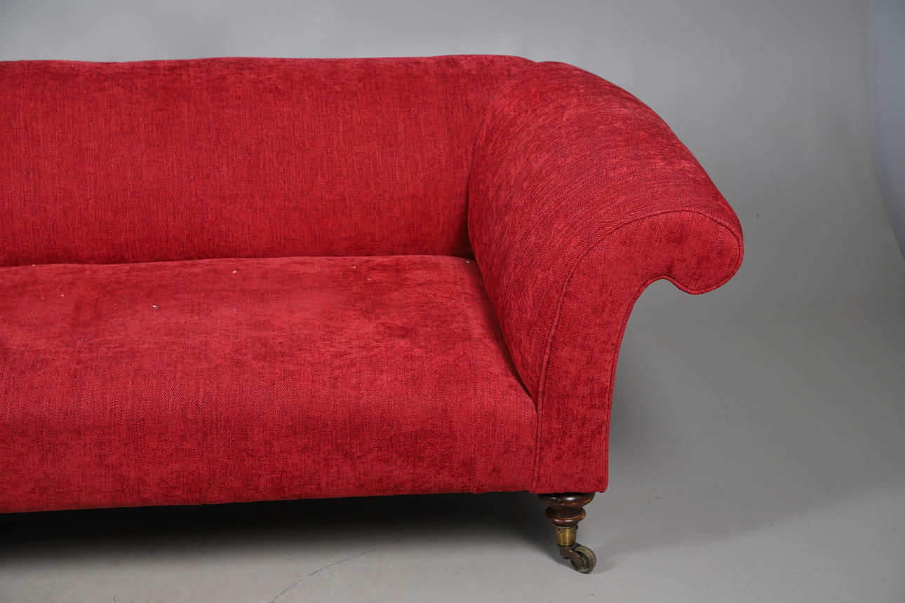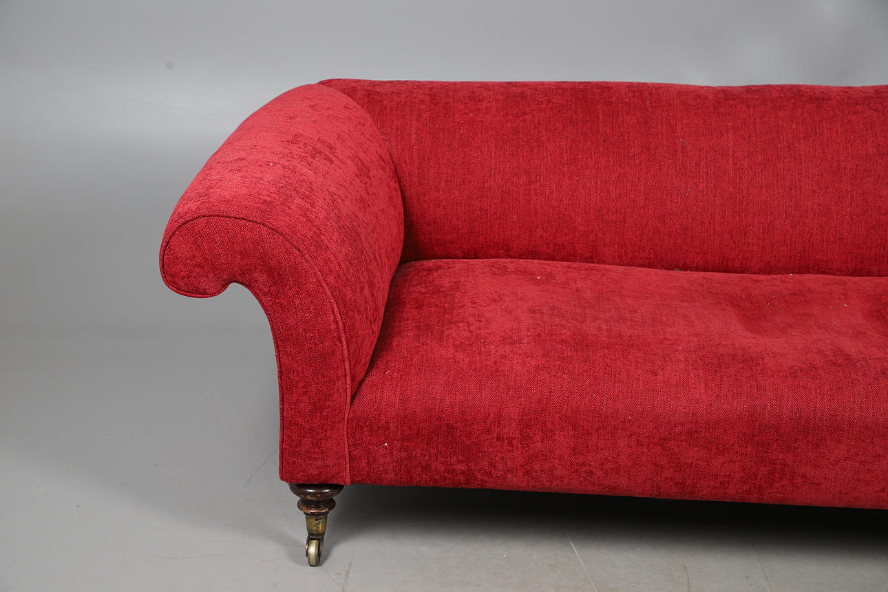 A large red velour chesterfield, with scroll arms and raised on turned supports and brass casters. 64cm (h) x 220cm (approx. w) x 94cm (d) x 37cm (seat height).
