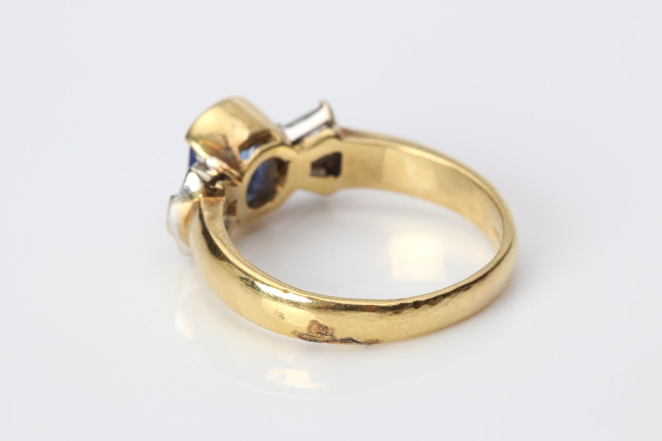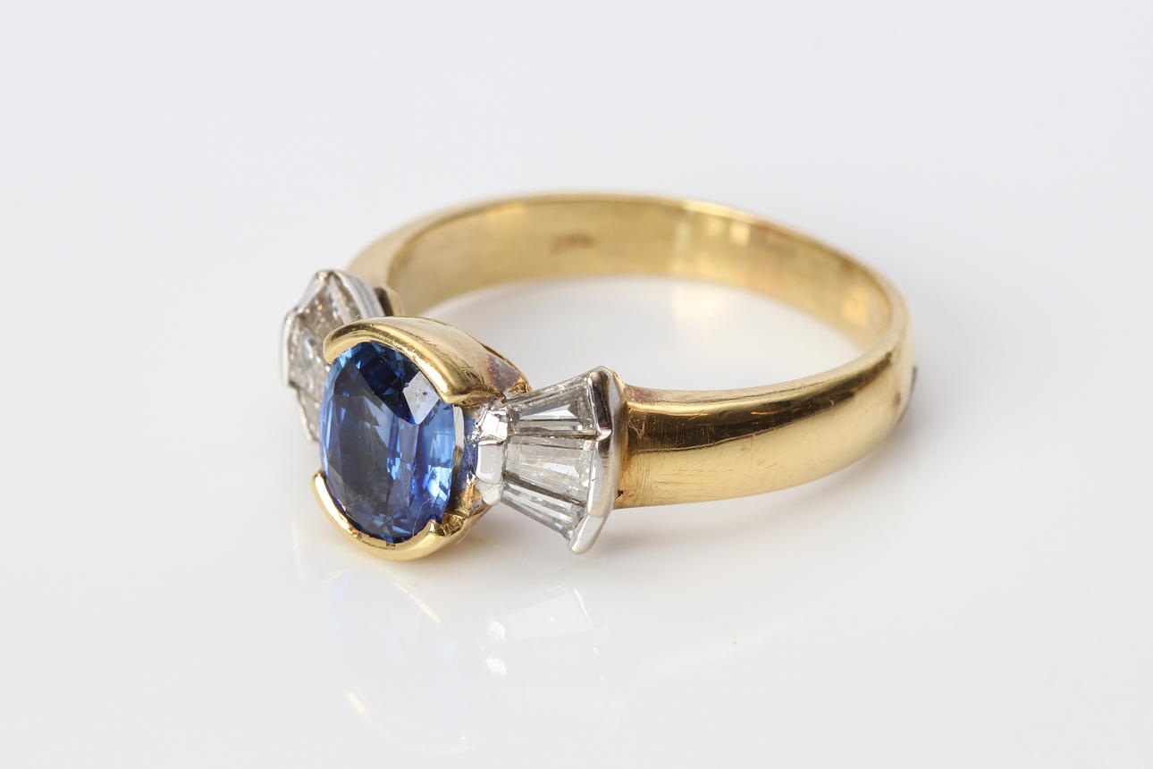Gold ring 18k with a faceted sapphire approx. 1.18 ct and diamonds approx. 0.24 ct, size approx. 17 mm, total weight 5.0 g.