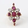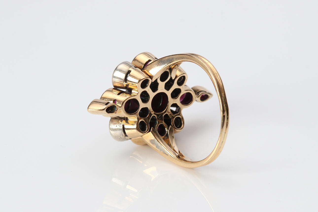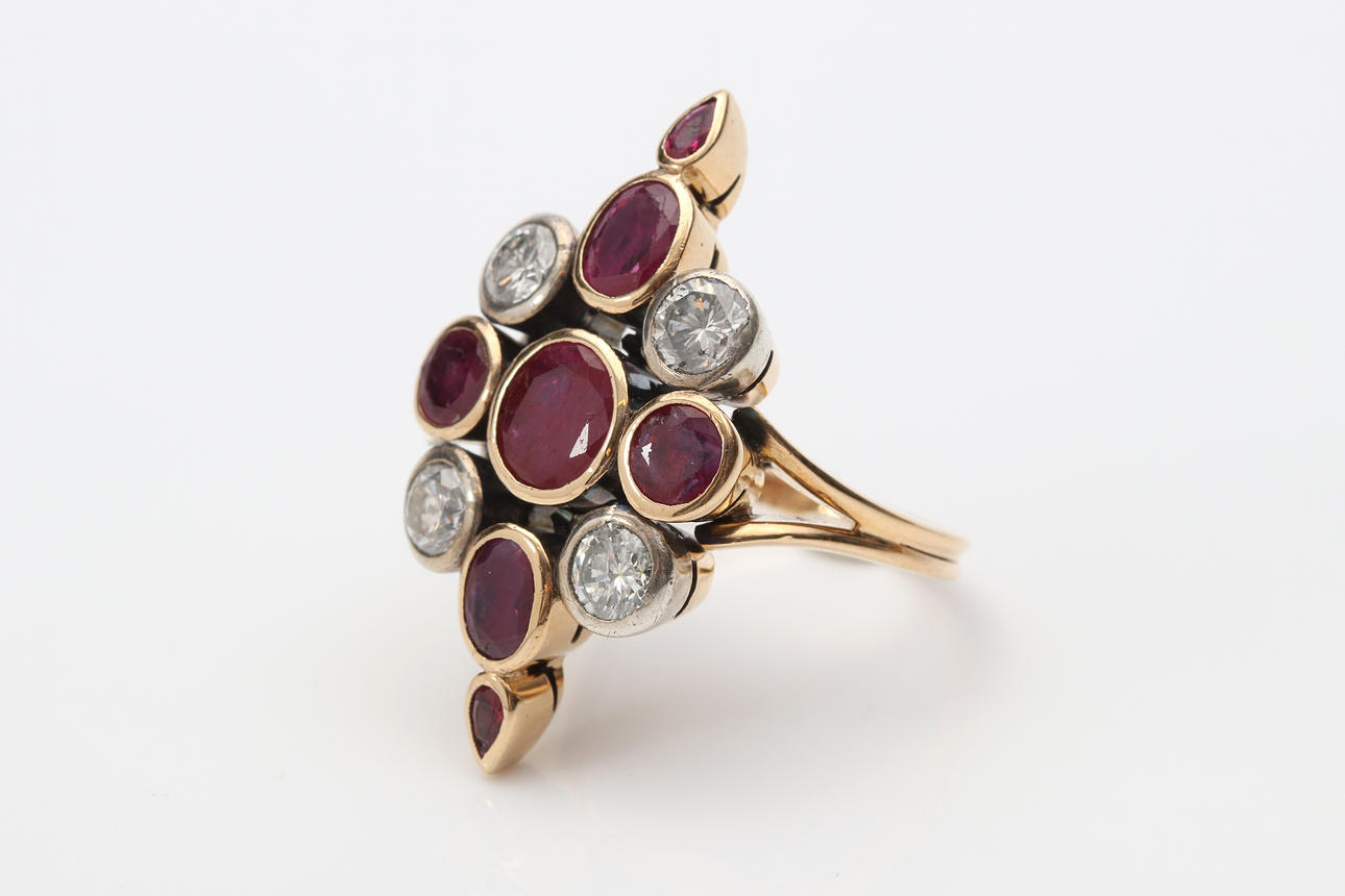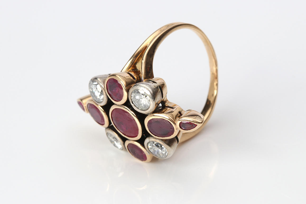 Ring 18k with faceted rubies and brilliant-cut diamonds approx. 1.50 ct, size approx. 19 mm, total weight 12.4 g.