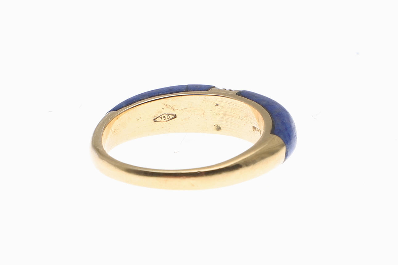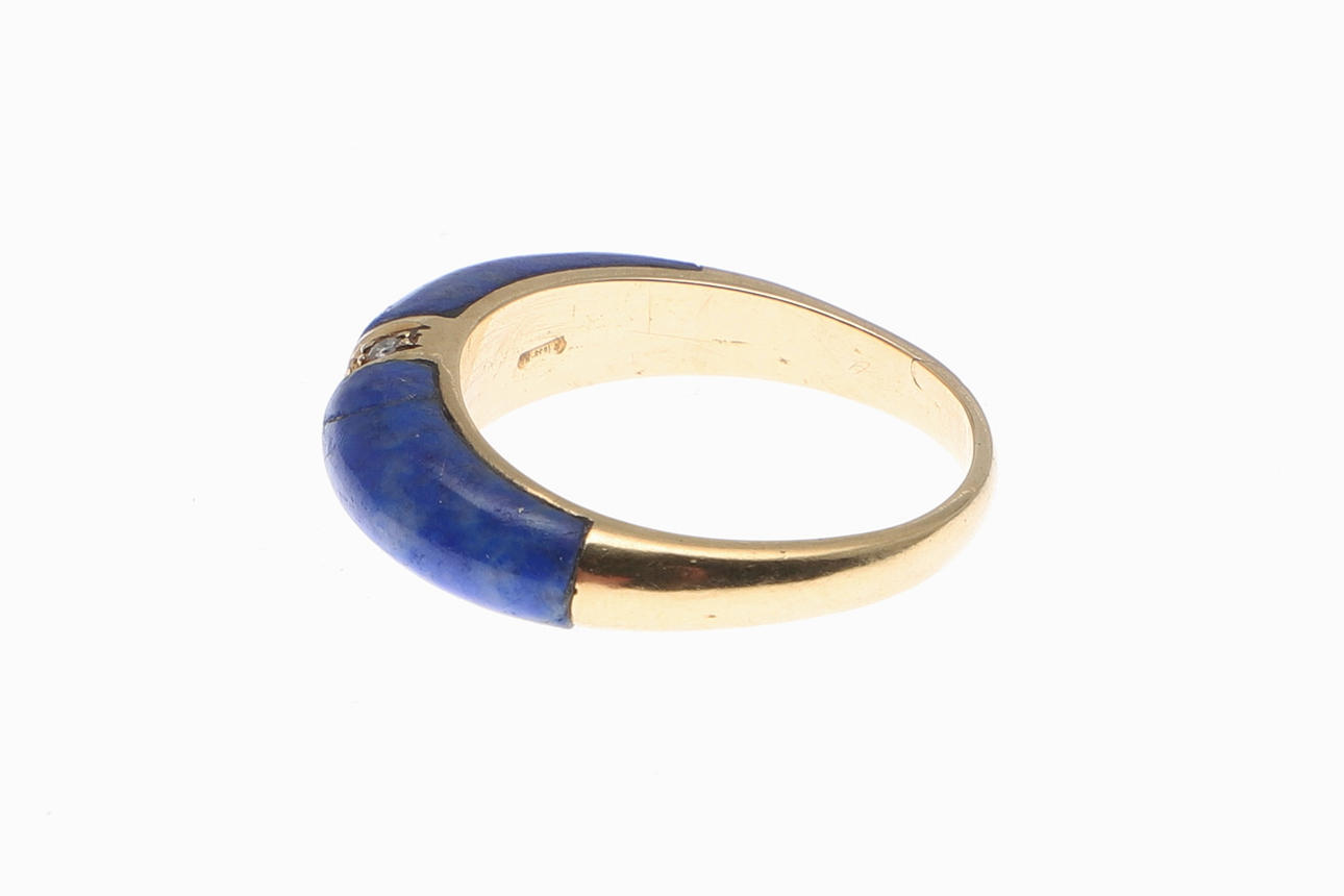 mounted with two sections of lapis lazuli and centred with three circular-cut diamonds, in 18ct gold, 4.4 grams. Size M 1/2.