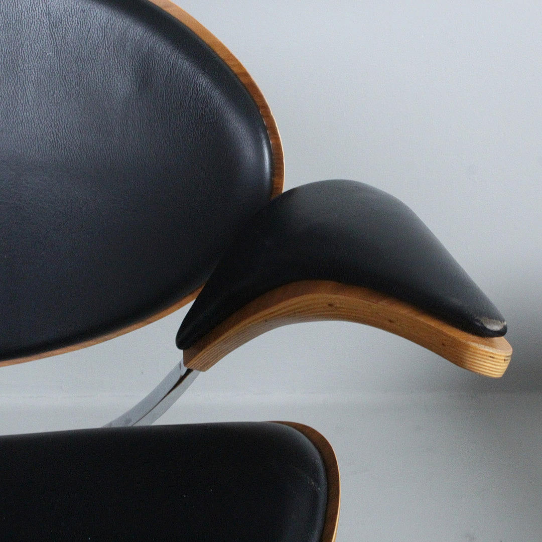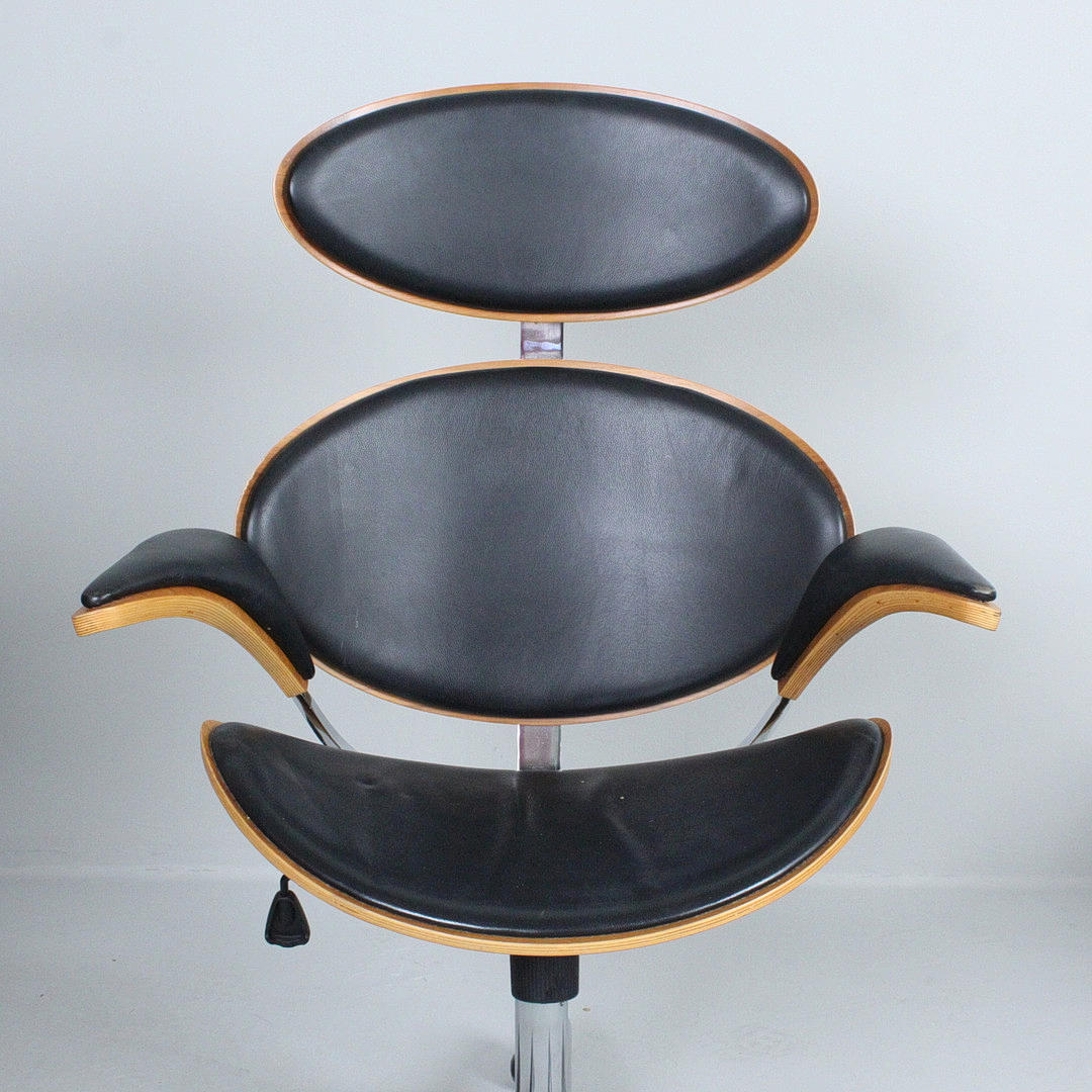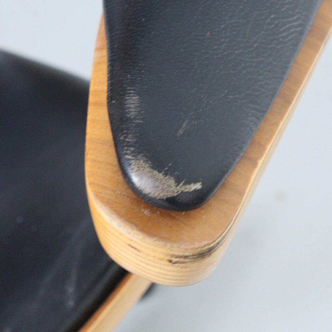 Office chair / armchair on casters, bent plywood construction, upholstered seat and backrest covered in black faux leather,
