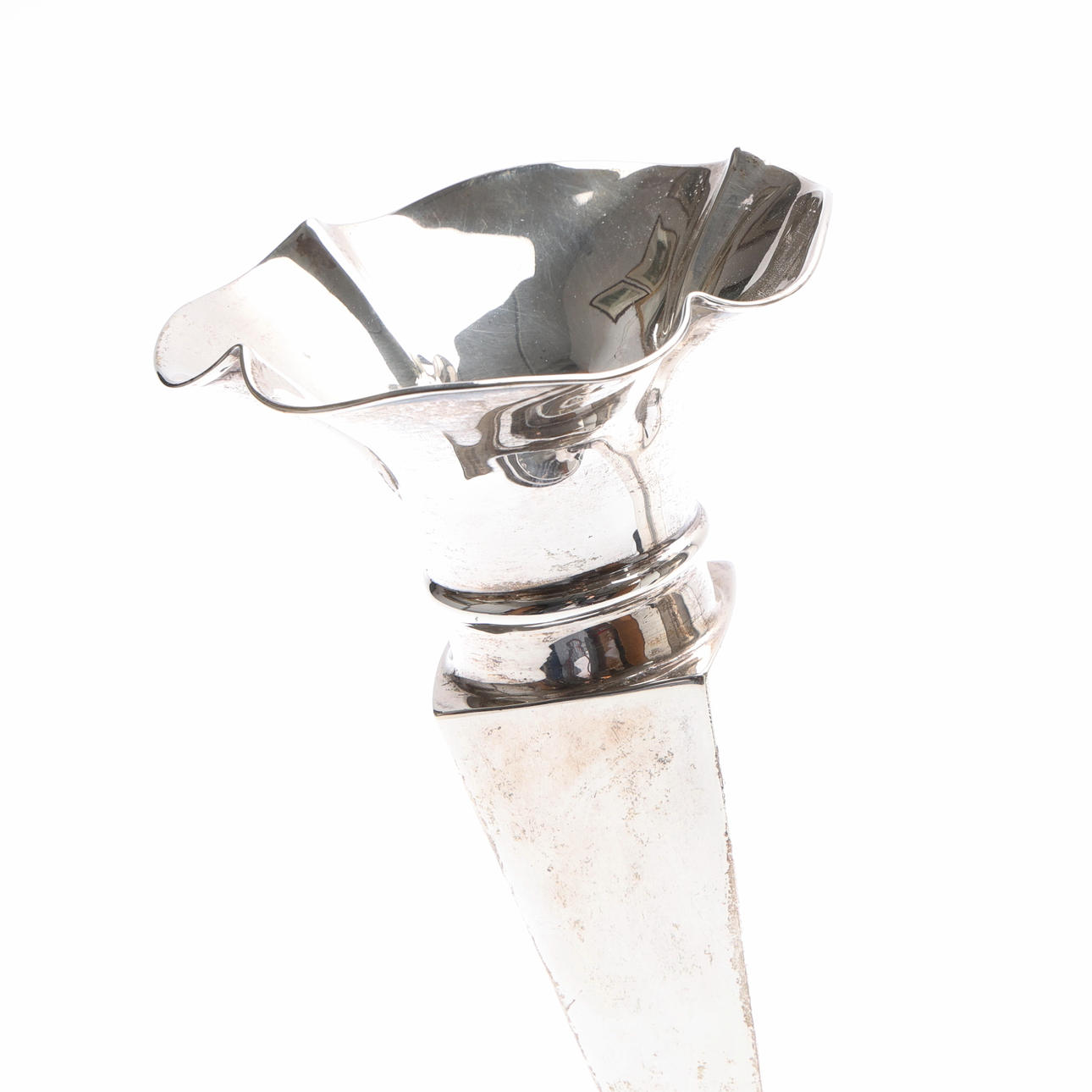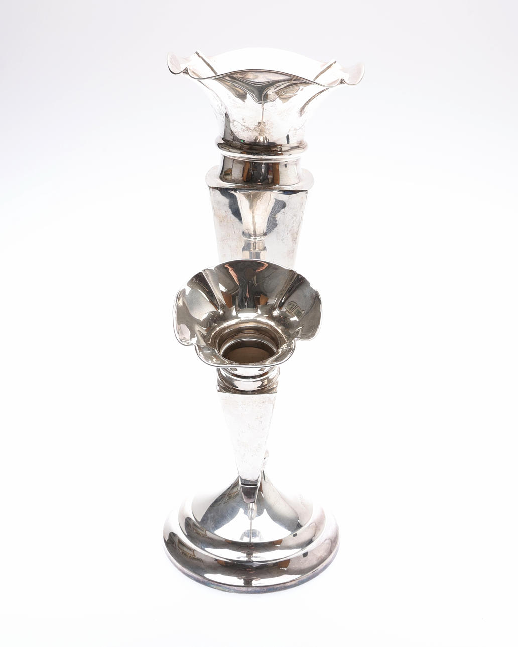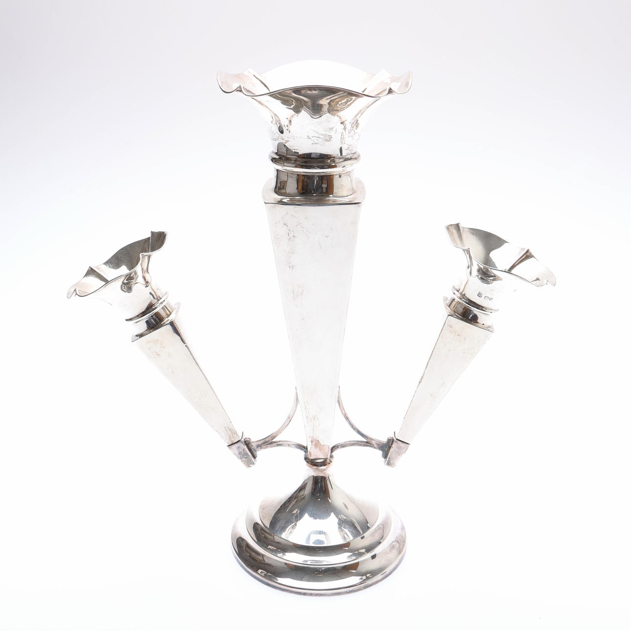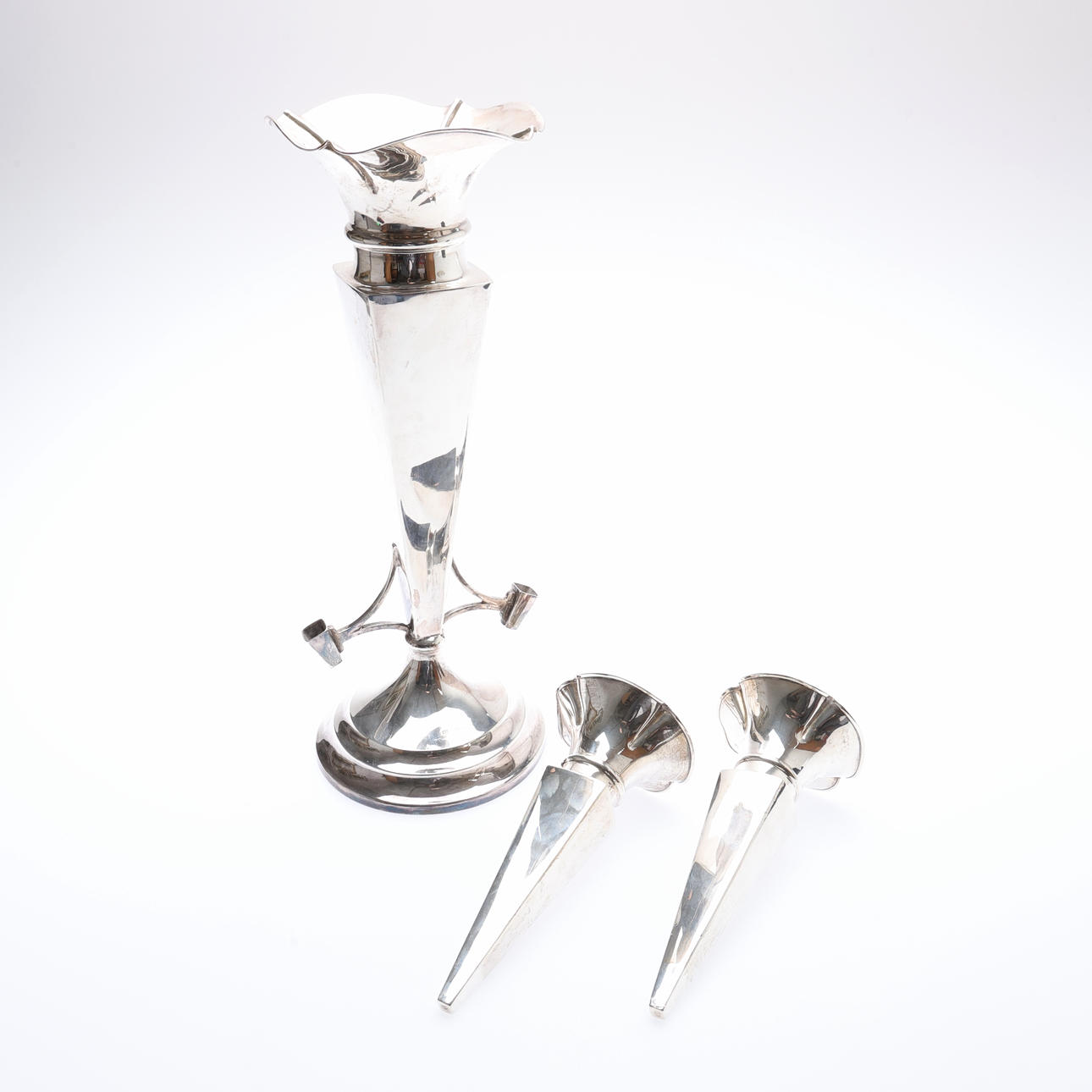 The central vase with a flared undulating rim and tapering square section body, flanked by 2 similar smaller and detachable vases, on a stepped circular foot, by John & William F. Deakin, Sheffield, 1912, H.36cm, (weighted base), weight of 2 detachable vases 156grs.