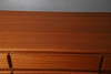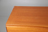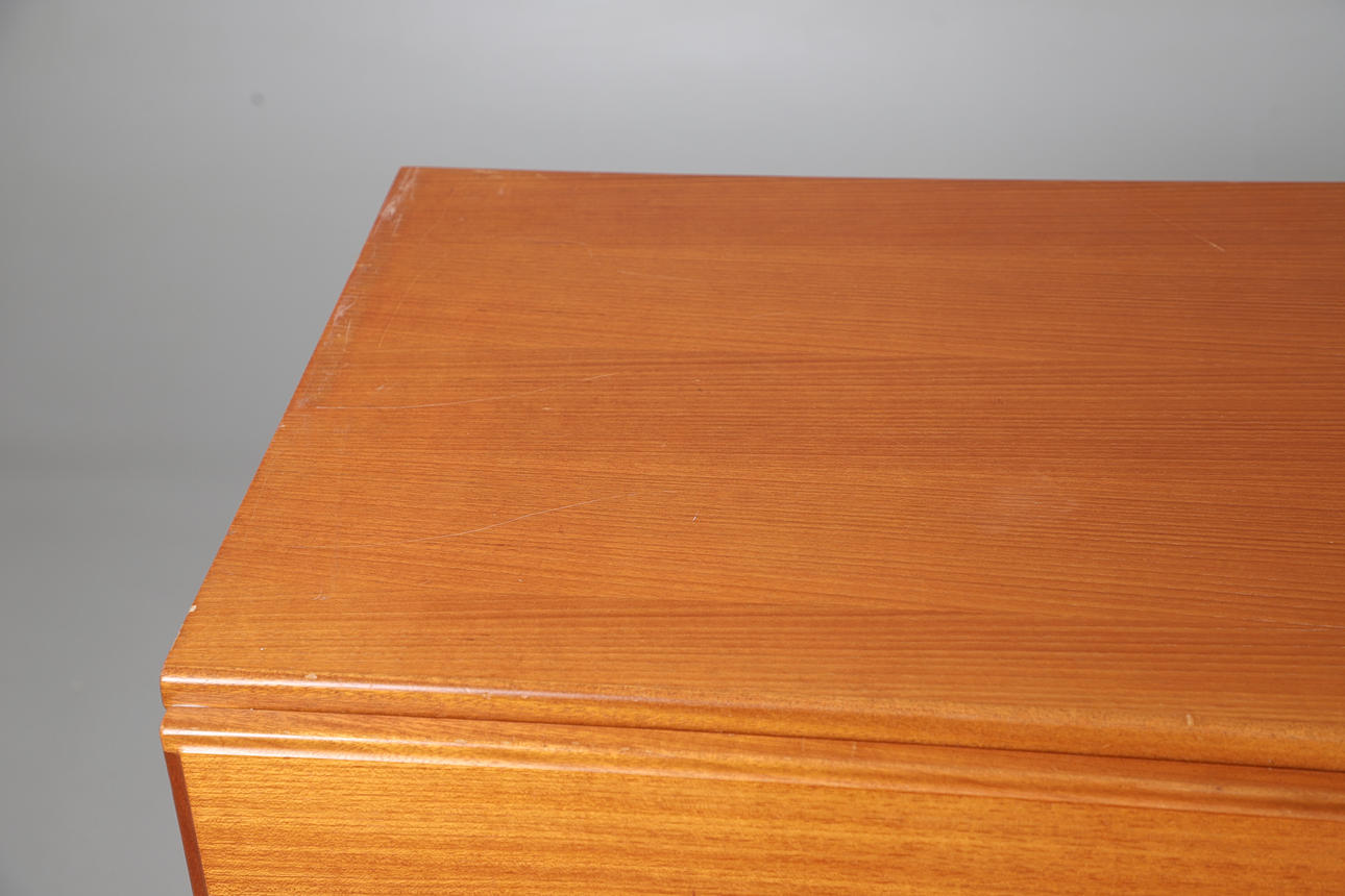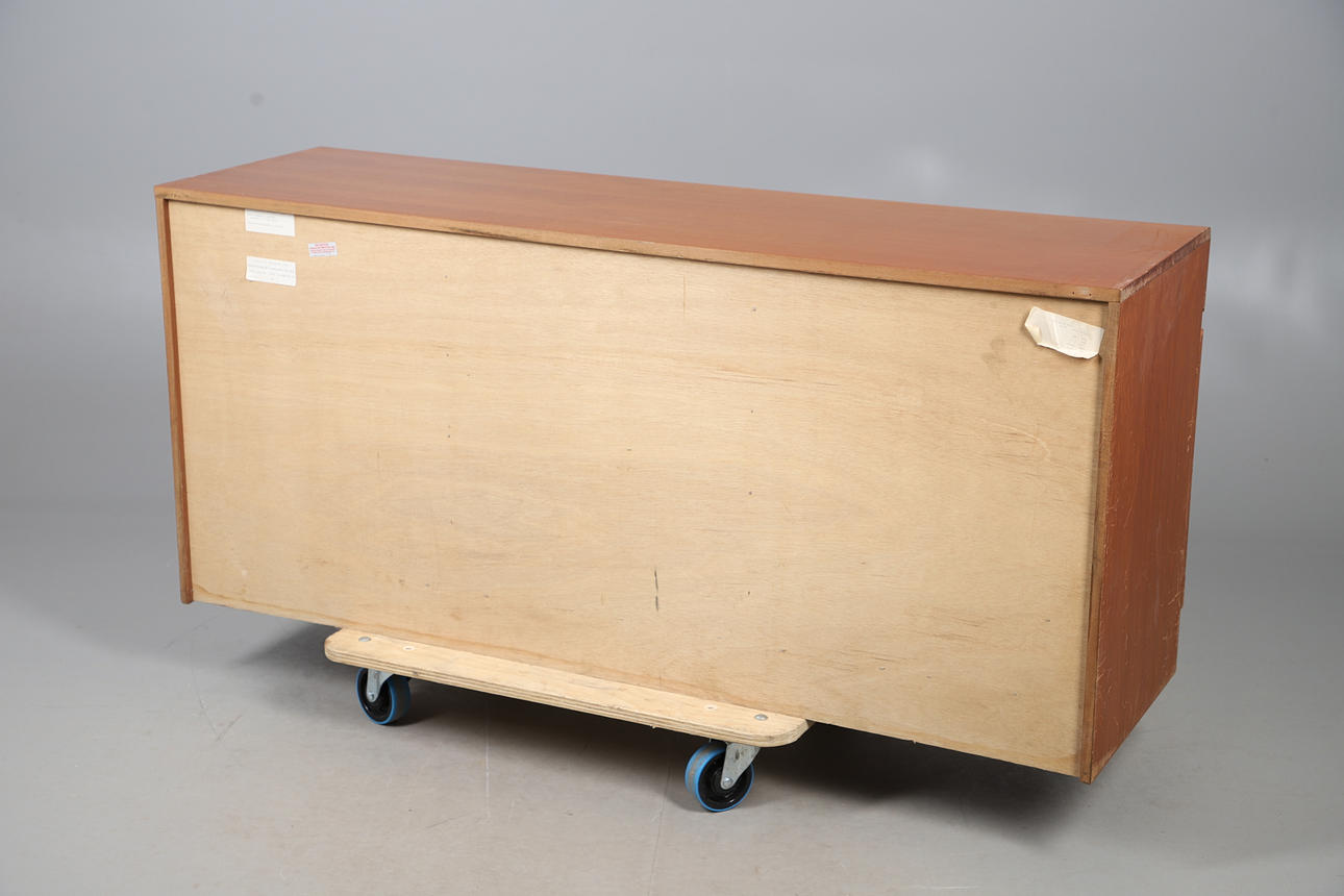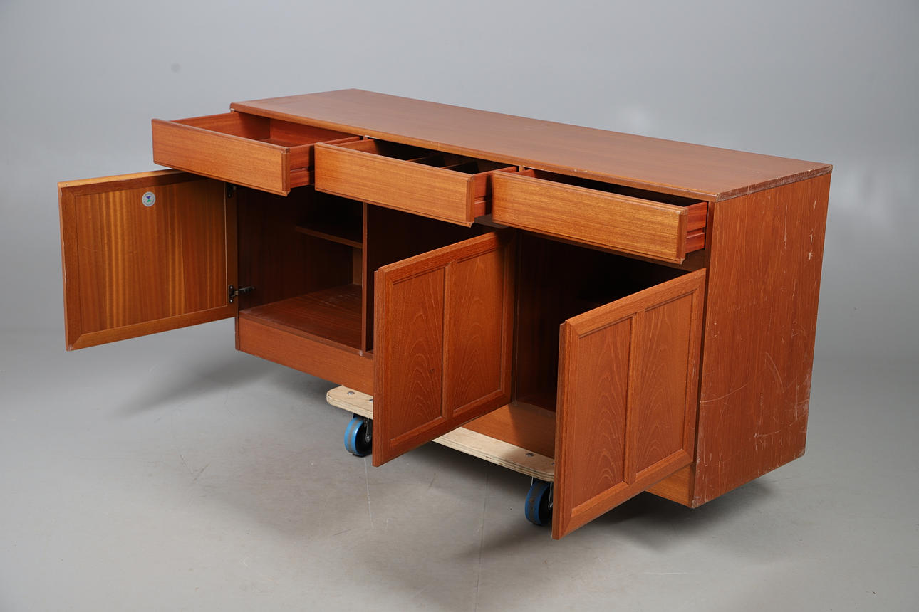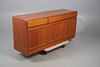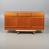Three short drawers above three paneled doors opening to two shelved compartments and a vacant compartment, W153 x 68.5 x D46.5cm.