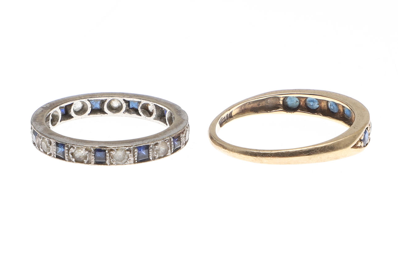 a sapphire half hoop ring, mounted with seven circular-cut sapphires in 9ct gold, 1.9 grams, size N, together with a sapphire and white stone full circle eternity ring, set in 9ct white gold, 2.3 grams, size K.