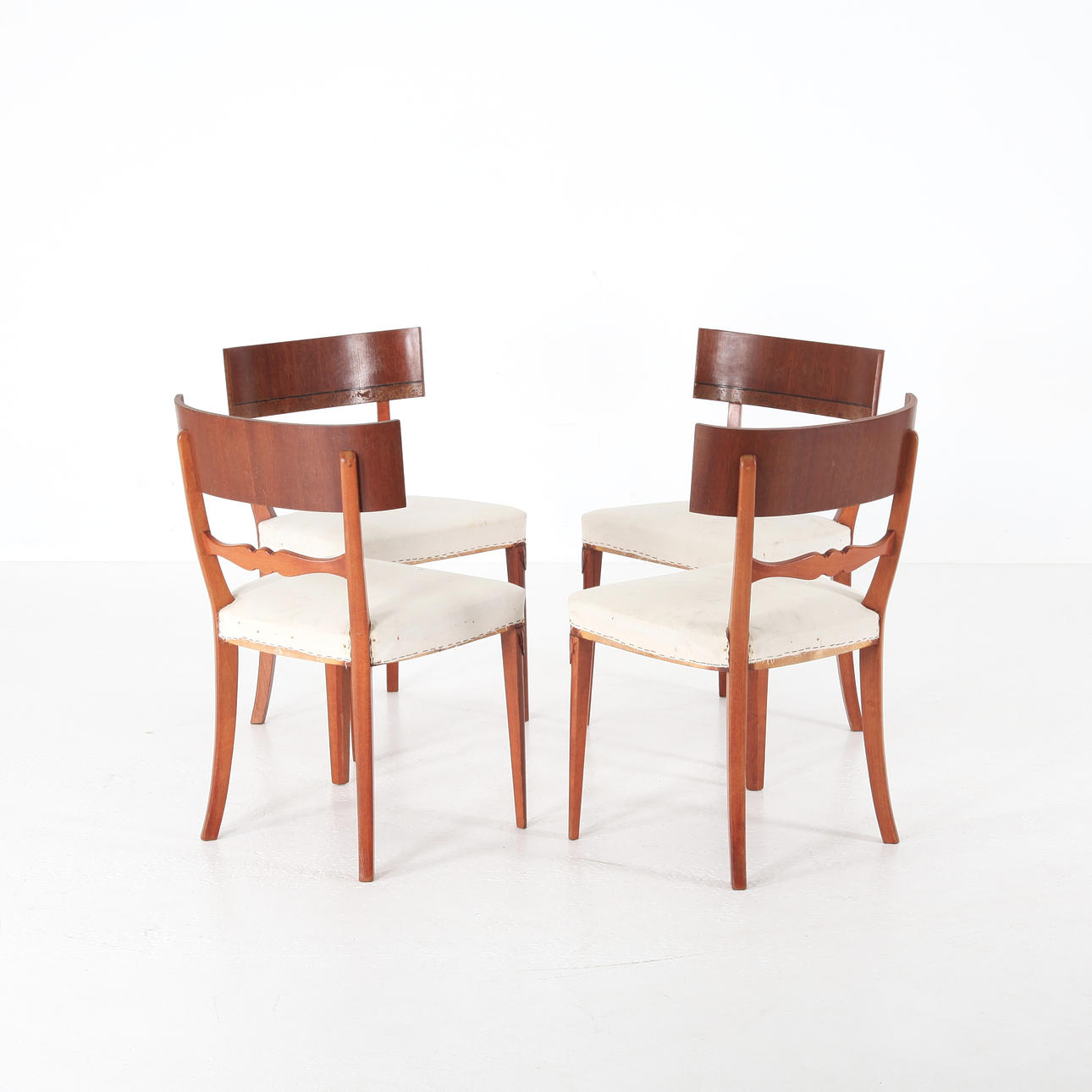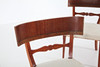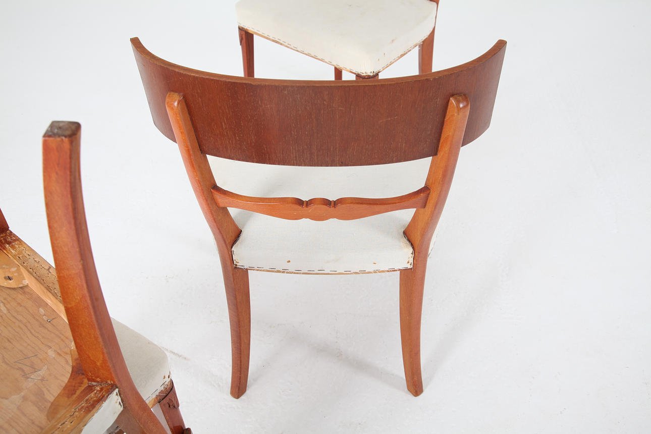 4 chairs, curved back splat, fixed upholstered seat. In the style of Otto Wretling, Sweden circa 1930.
