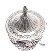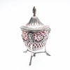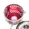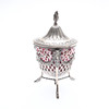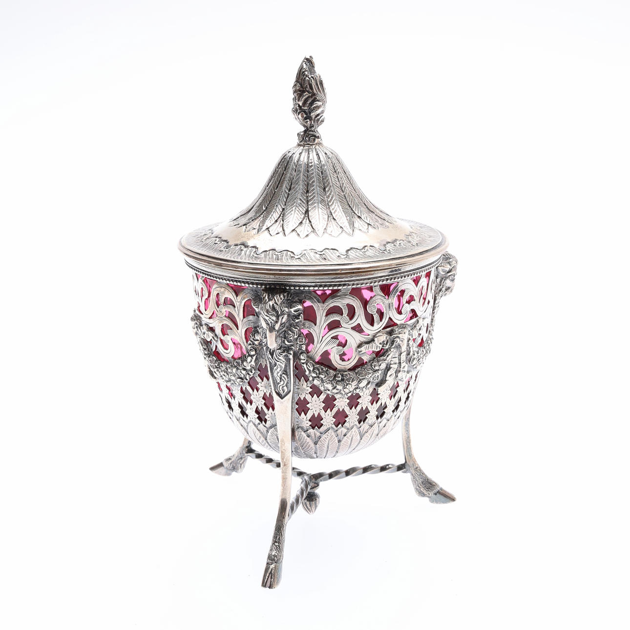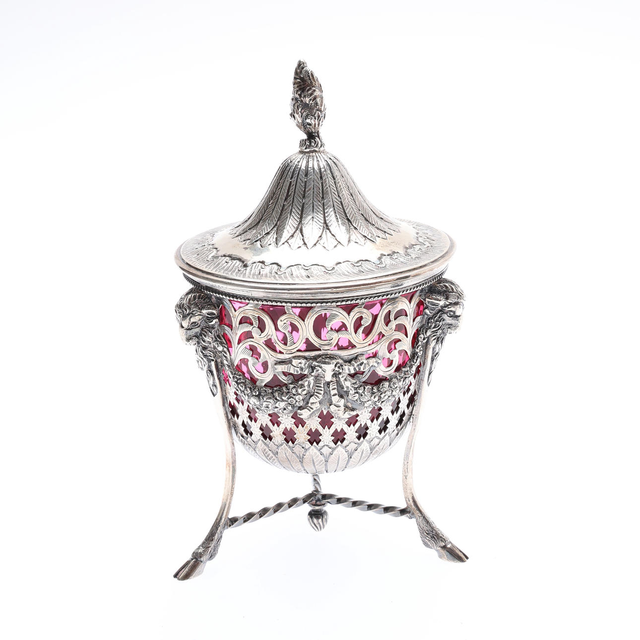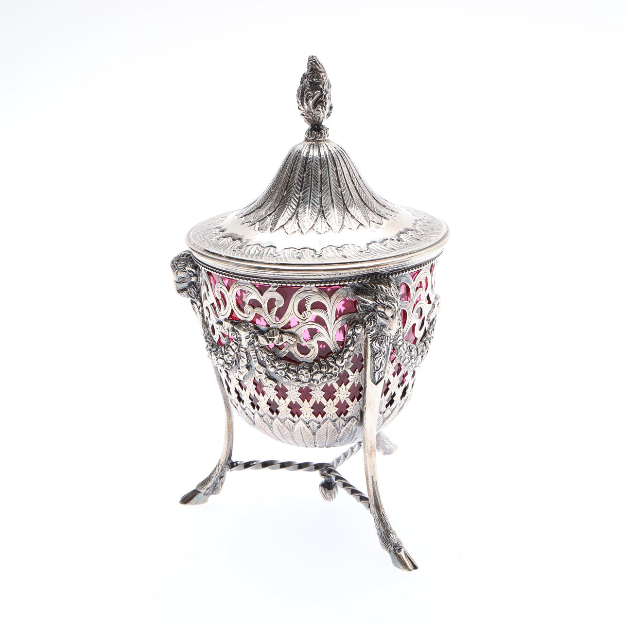The domed cover with a flame finial and chased and embossed foliate decoration, the body with pierced scrolling and lattice decoration, with 3 ram's masks joined by floral and ribbon festoons, on 3 hoof feet joined by a rope-twist stretcher, with a cranberry glass liner, by Joseph Clarke, London, 1896, H.18cm, 398grs.