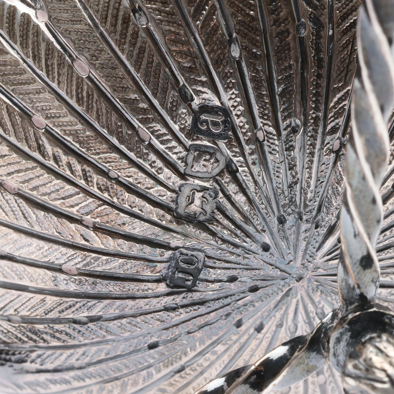 Finial slightly bent. Tarnishing, light nicks, scratches.