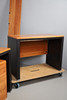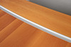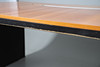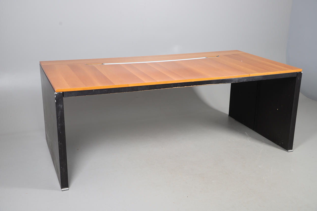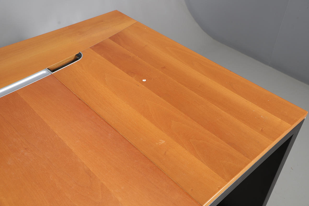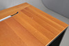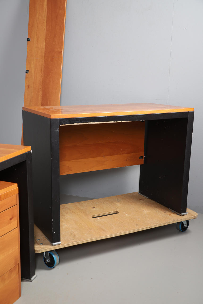 A large cherrywood finish desk, comprising of a chest of four graduated drawers and a large table top. Size of table top, 200cm x 98cm. Approximate height of desk, 81cm. (6 parts).