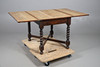 An unusual oak draw leaf table, with flaps on the top that fold over supported on sections that pull out on each side. Supported on barley twist legs and cross supports, and with a retailers label on one side for 'Duplex Table'. Extended 90.5cms by 150cms, closed 90.5cms by 74.5cms, 75cms high.