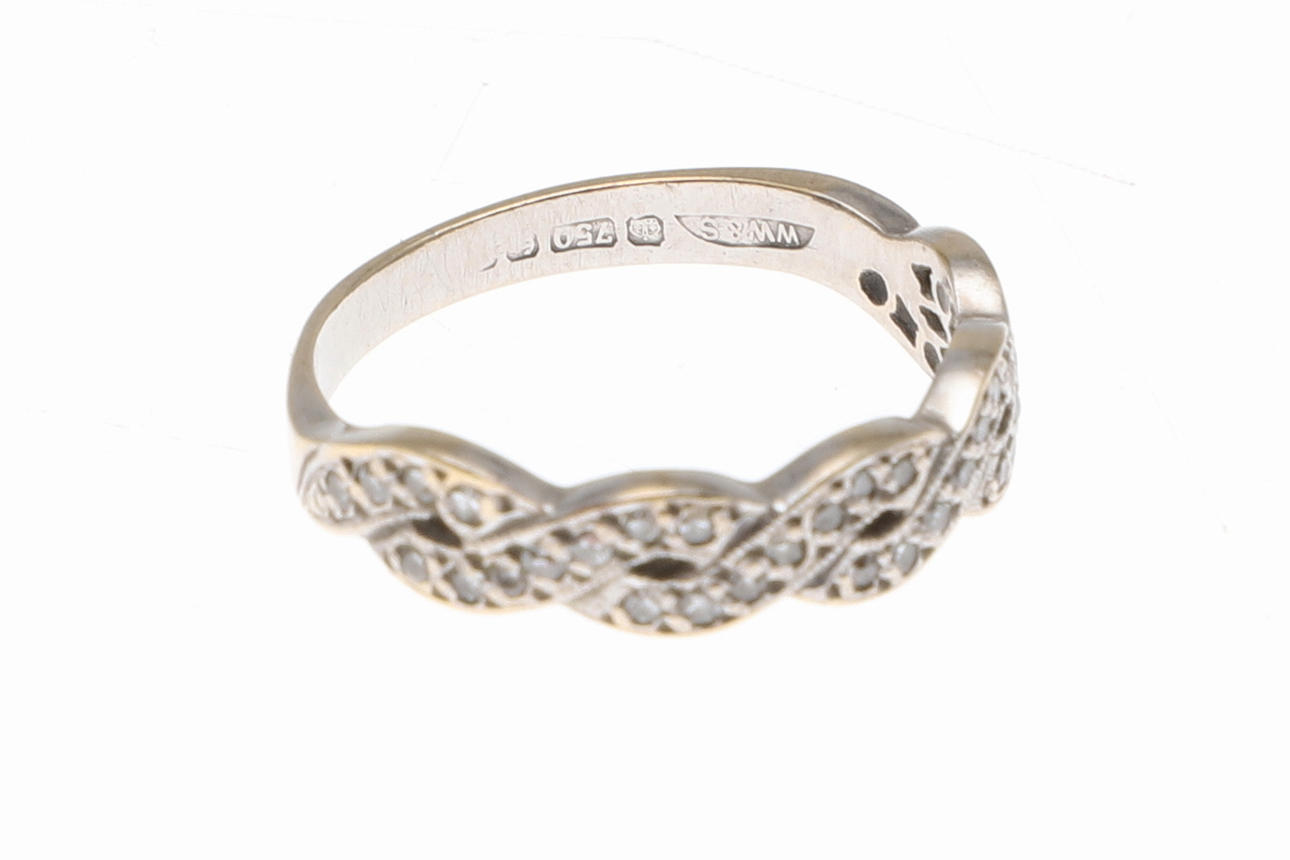 5027511. A DIAMOND AND 18CT GOLD HALF HOOP RING.