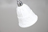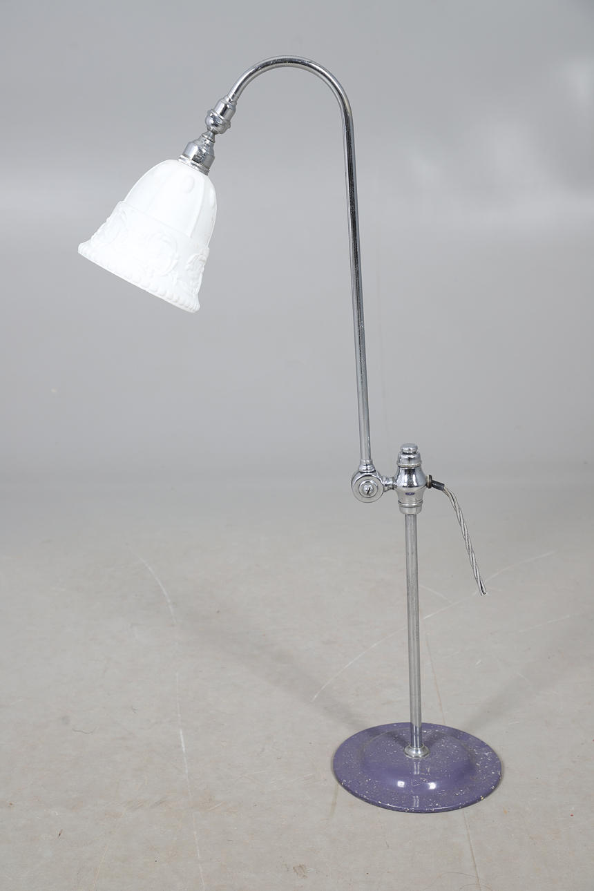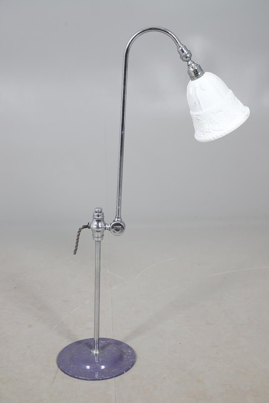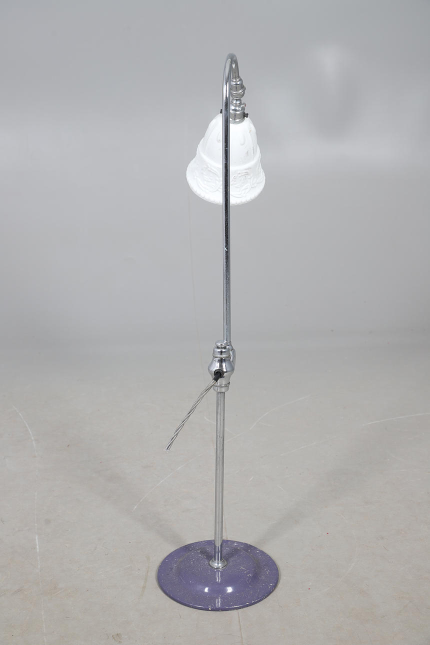With relief foliate patterned frosted glass shade, chrome neck and purple metallic base, H80cm.