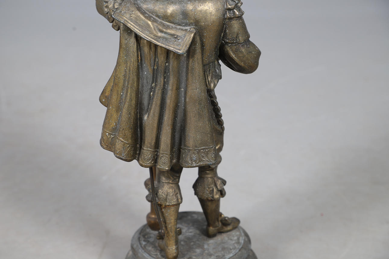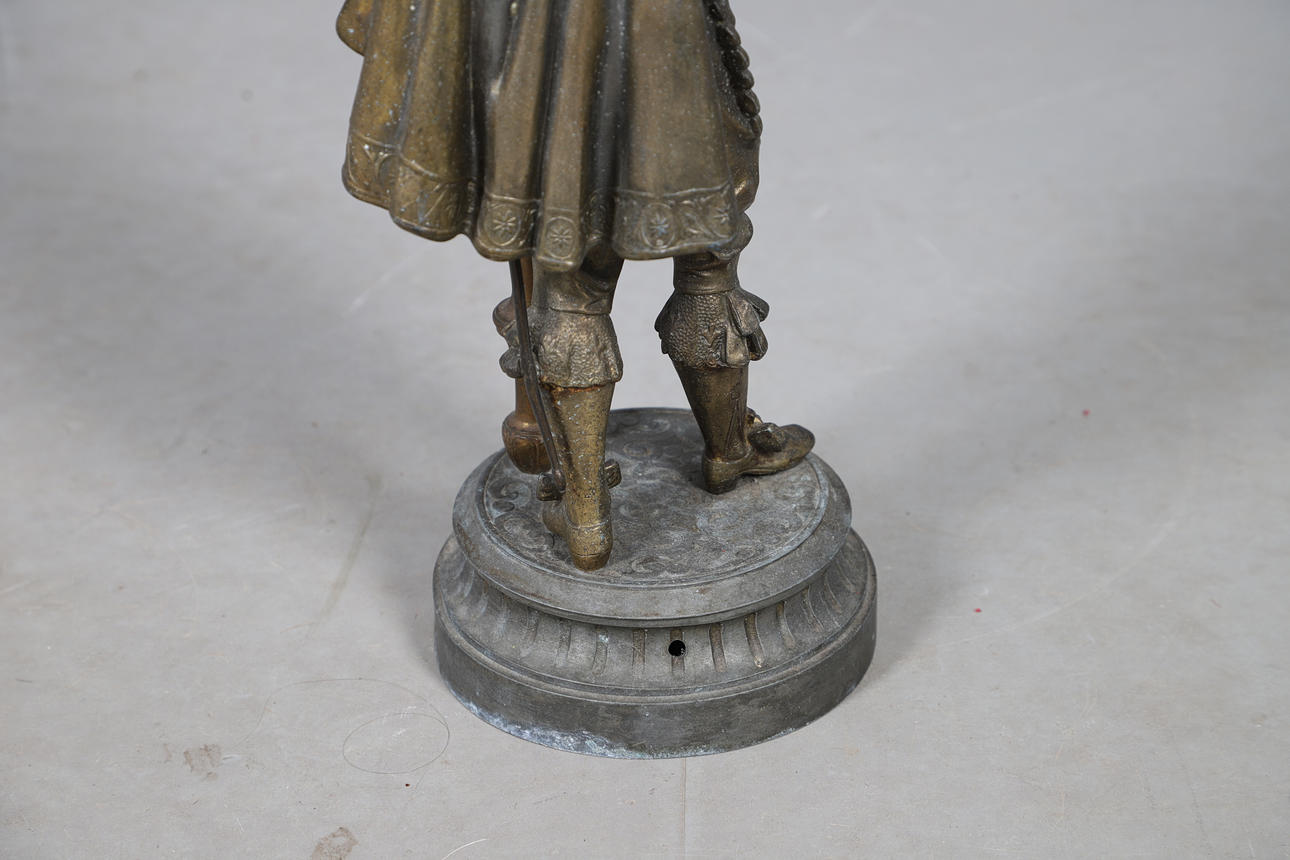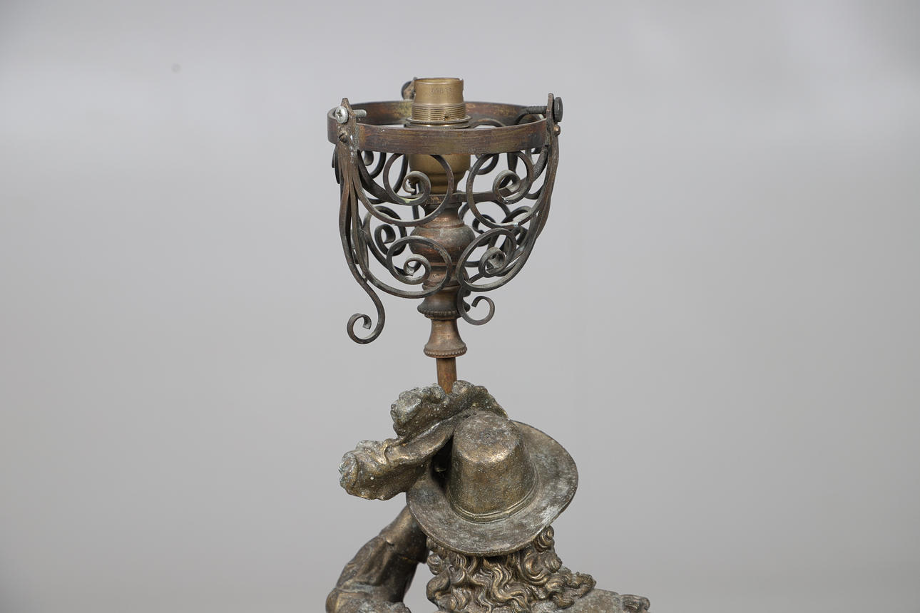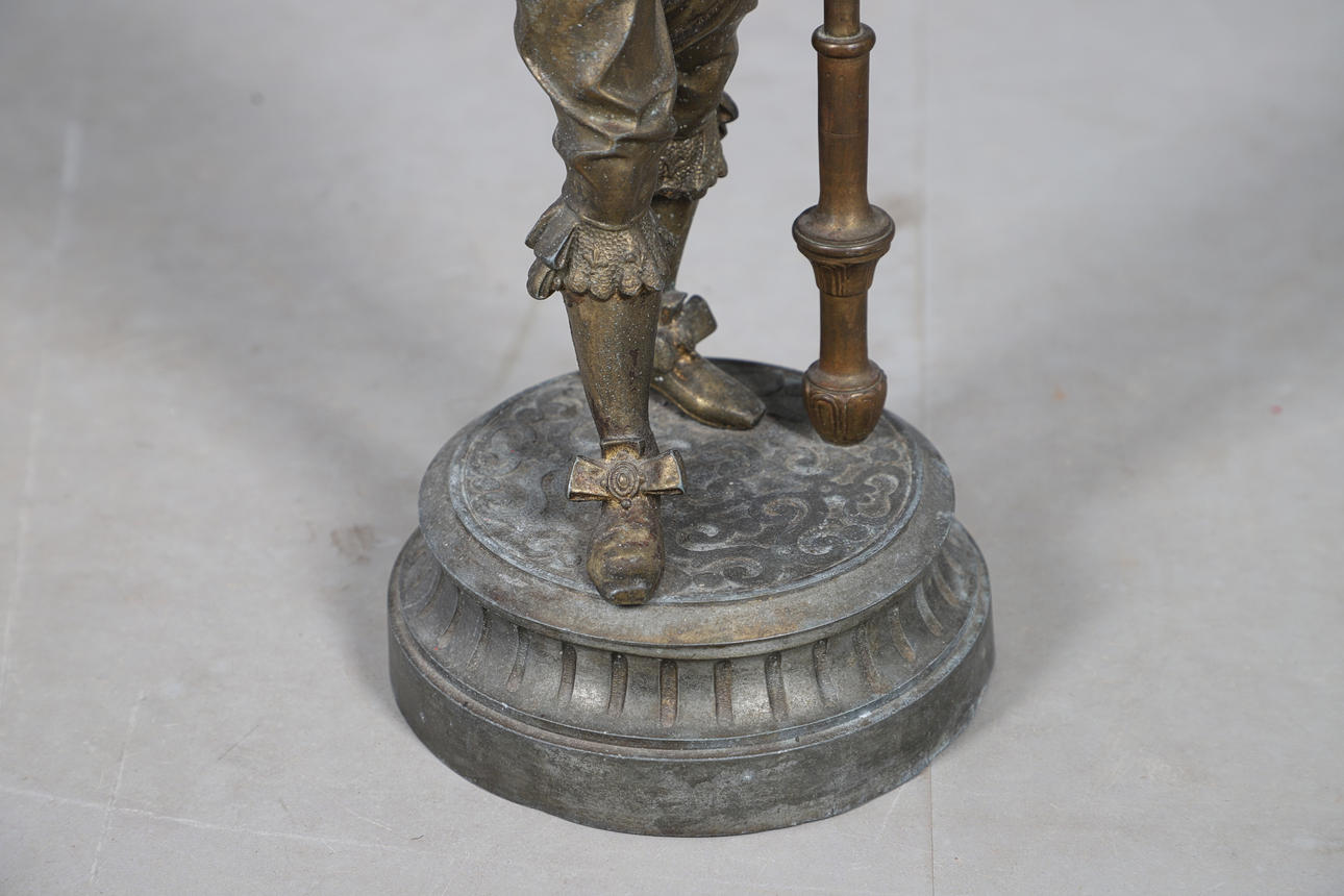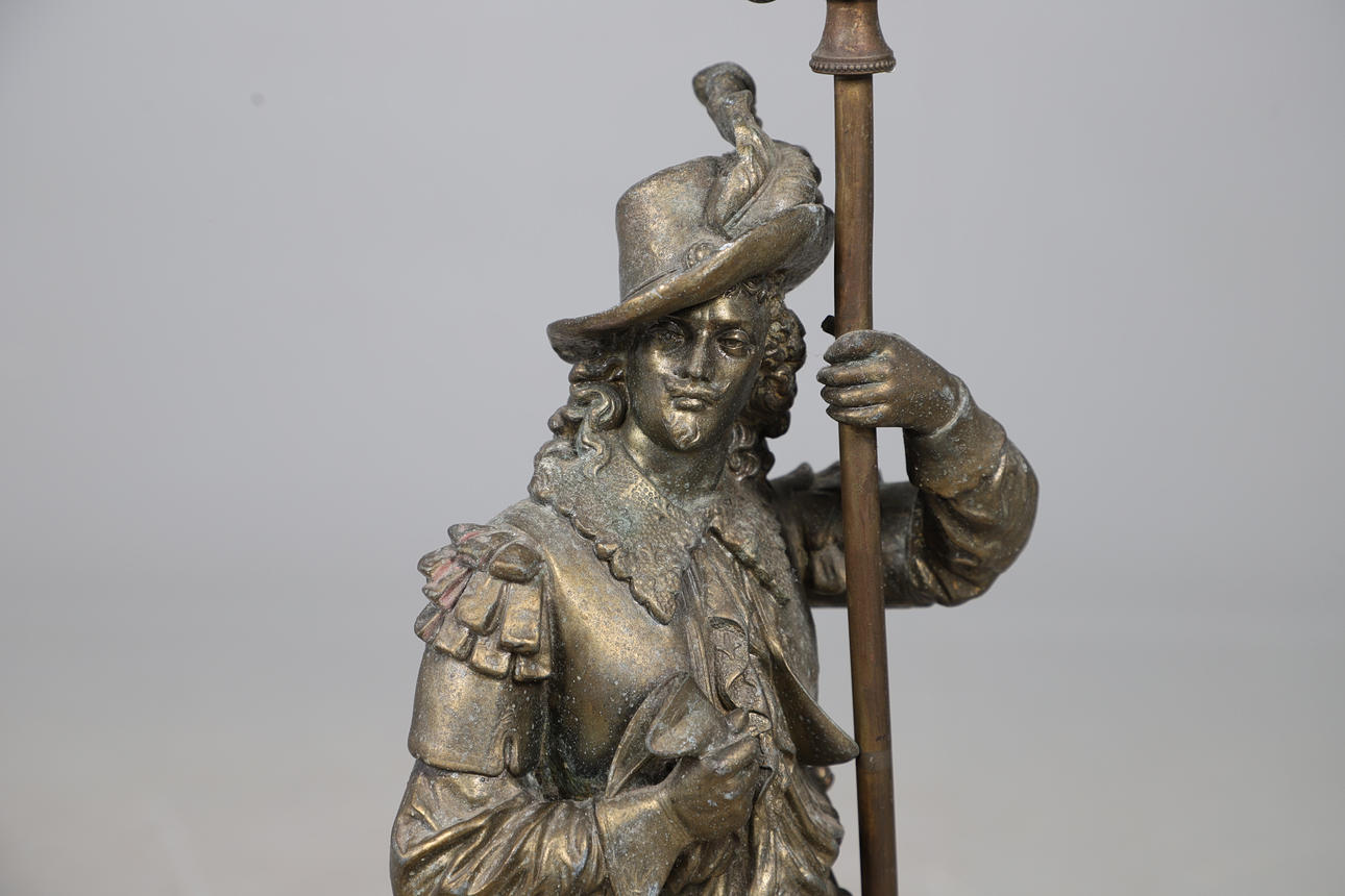 Of 17th century soldier holding standard mounted with torch based lamp, raised on pedestal base, H63cm.