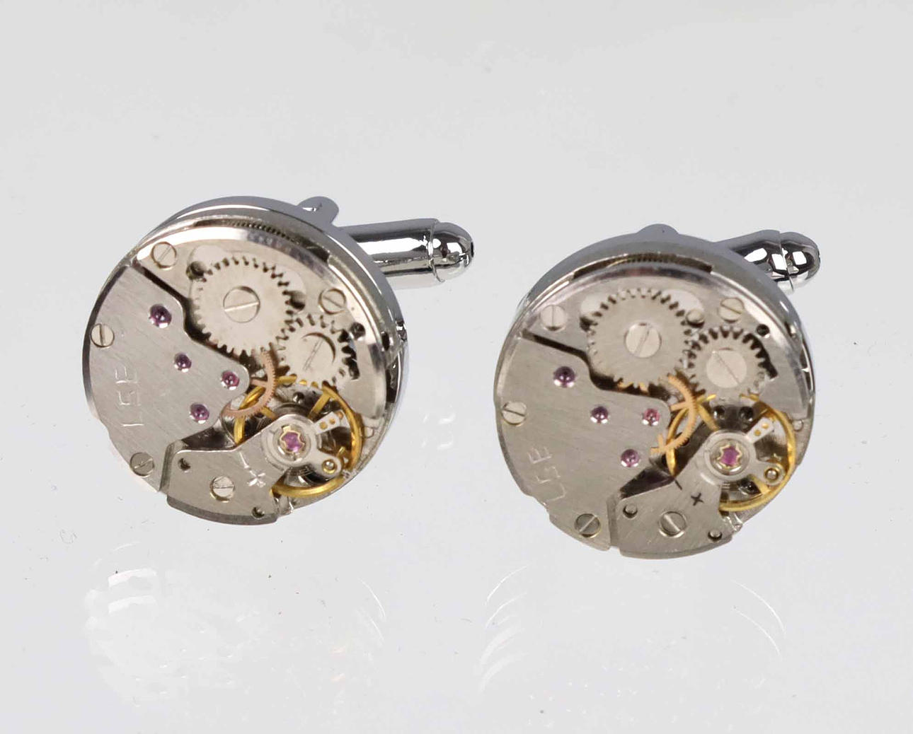 Cufflinks in the shape of a watch movement, highly detailed, in chrome, diameter of faces 17 mm.