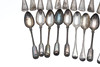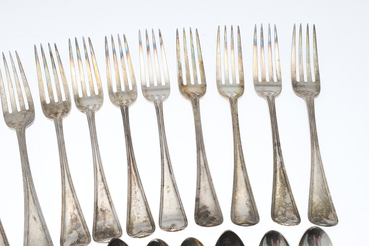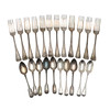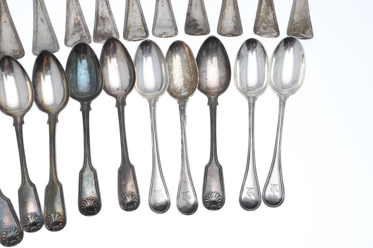To include a set of twelve Old English thread pattern table forks (Length 20cm, hallmarked George Smith (II), London, 1805), a set of six George III Fiddle, Thread and shell pattern teaspoons (hallmarked Josiah & George Piercy (London), 1776) and a set four Victorian Old English Thread pattern table spoons with engraved crest to the handles. Total lot weight 33.8ozt. (22).