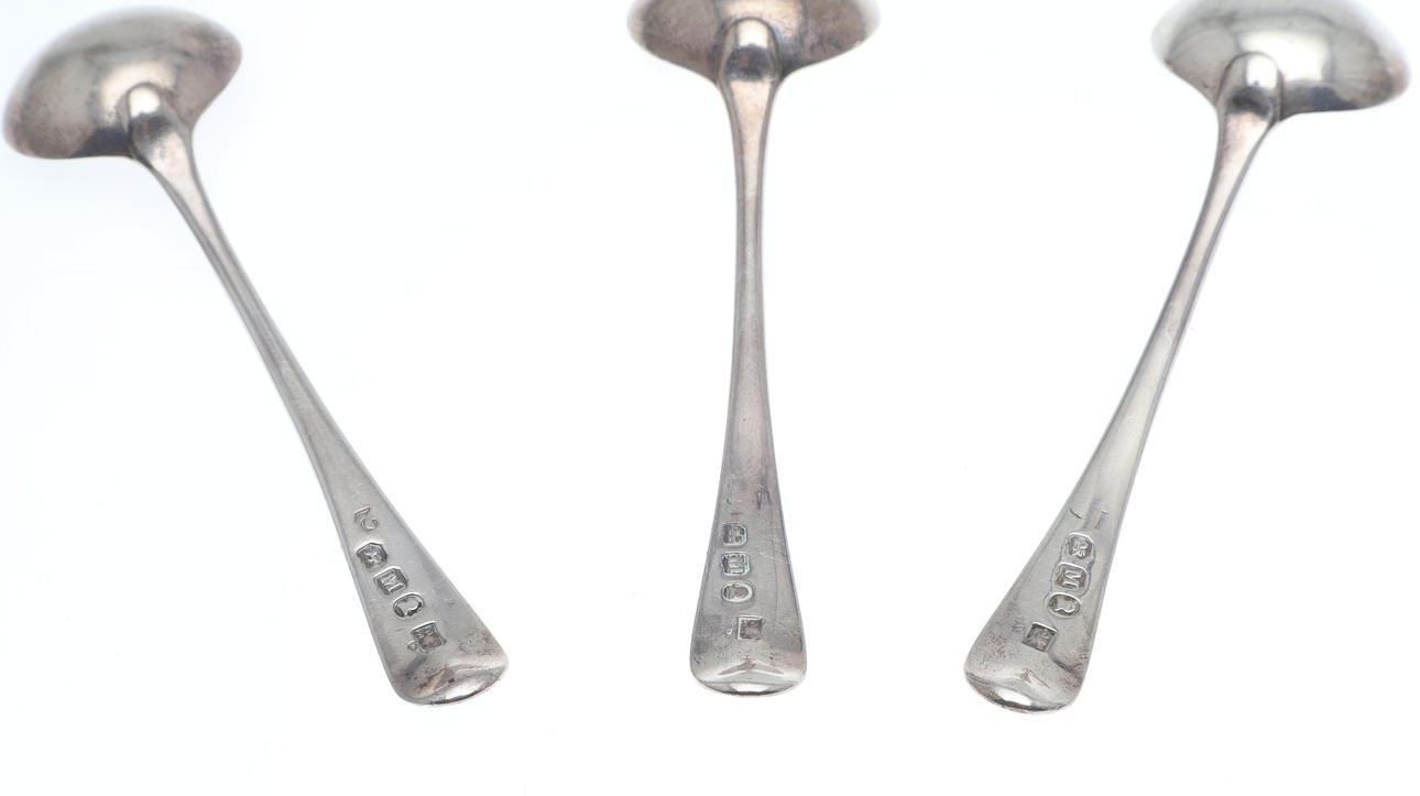 three fiddle pattern salt spoons hallmarked London 1807 with crested handles, 1.3ozt.