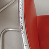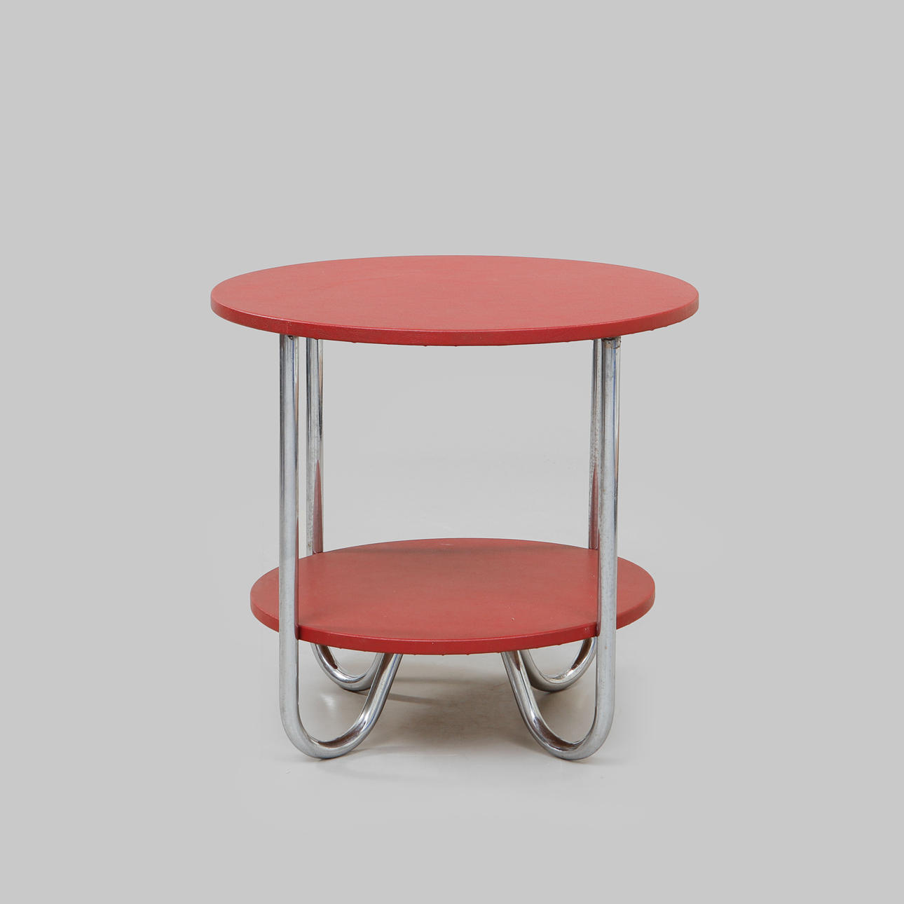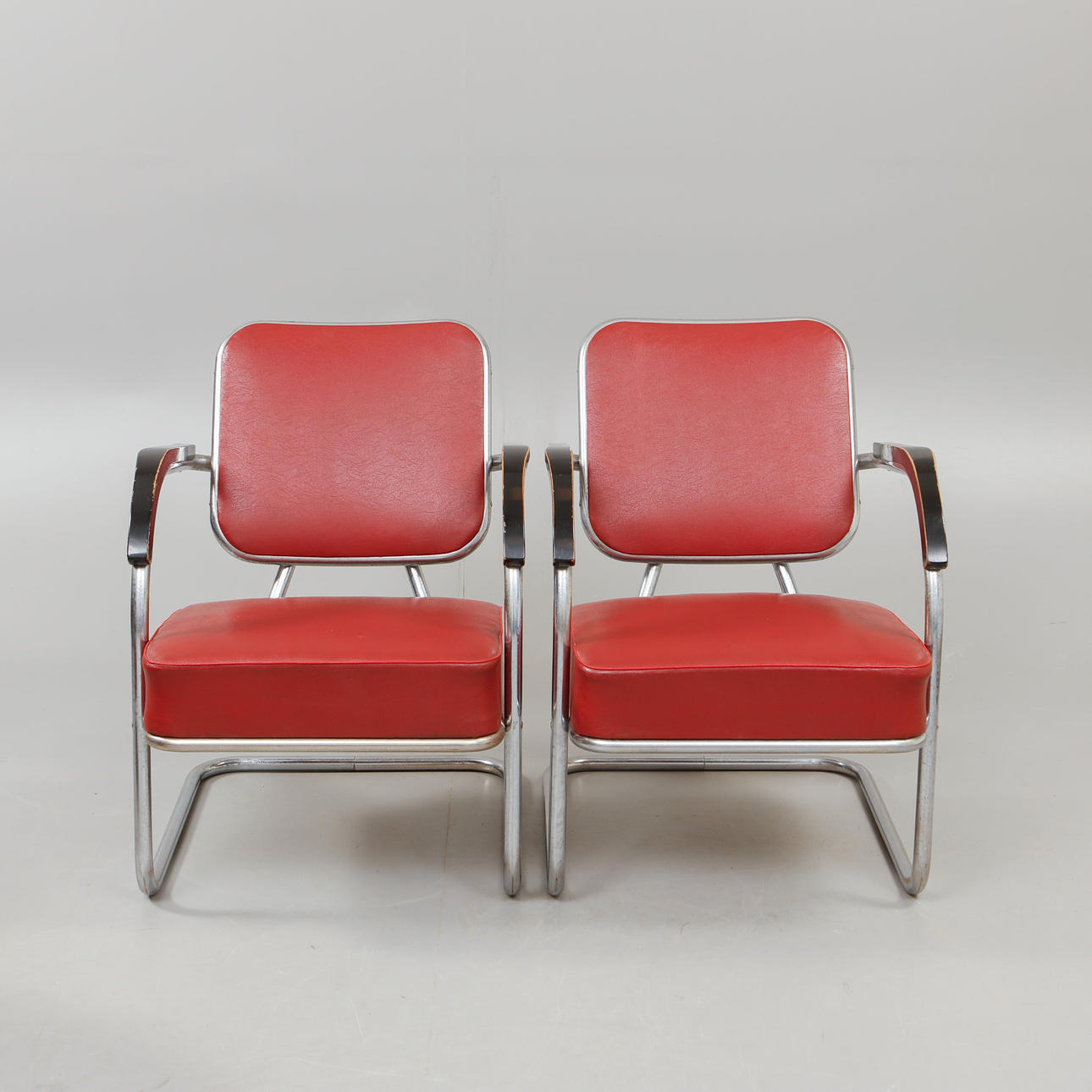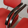 Steel frame, vinyl upholstery, wooden armrests. Seat height approx. 40 cm, back height approx. 75 cm, width approx. 55 cm, depth approx. 78 cm. Table diameter 65 cm, height 61 cm.
