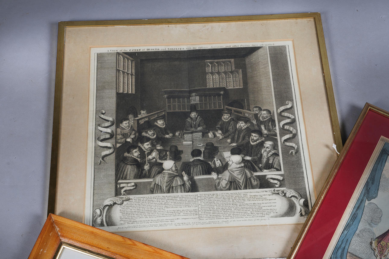 To include the theatrical atlas, hand-coloured engraving housed in a gilt and glazed frame, a view of the Court of Wards, together with a plan of William Rowley's dog kennels as well as a hand-coloured engraving, the largest 63cm by 63cm (3).