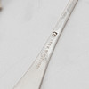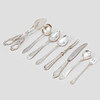 sugar tong blades, knife blades, fork part not silver. Engraving, wear from use.