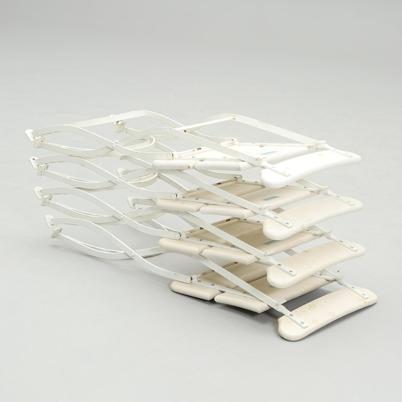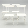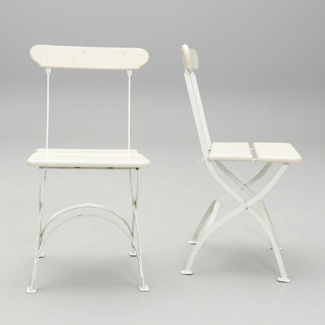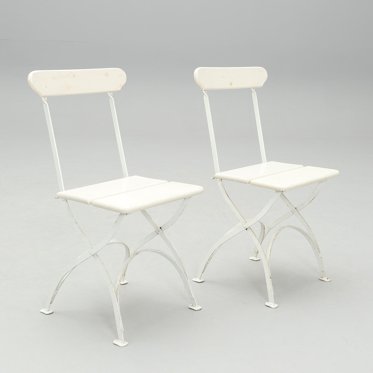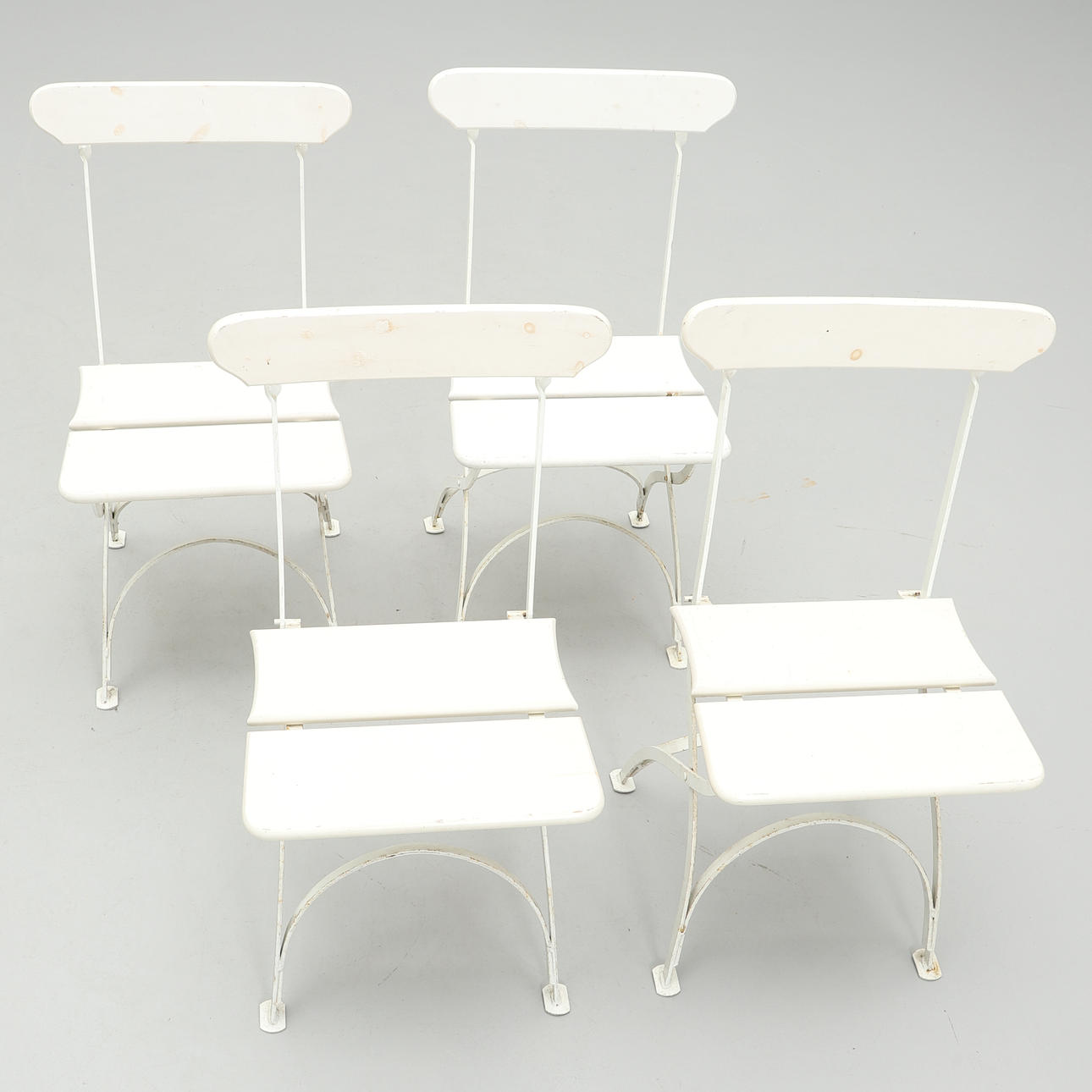 White-painted flat iron and wood. Labelled. Width 42, depth 45, back height 86, seat height 47 cm.