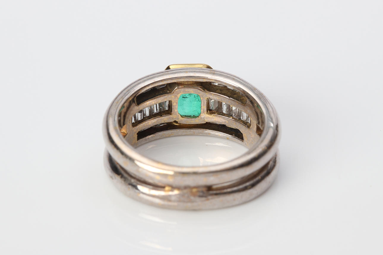 Ring 18k with a faceted emerald approx. 7 x 7 mm and baguette-cut diamonds approx. 0.95 ct, size approx. 17 mm, total weight 9.5 g.