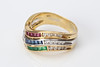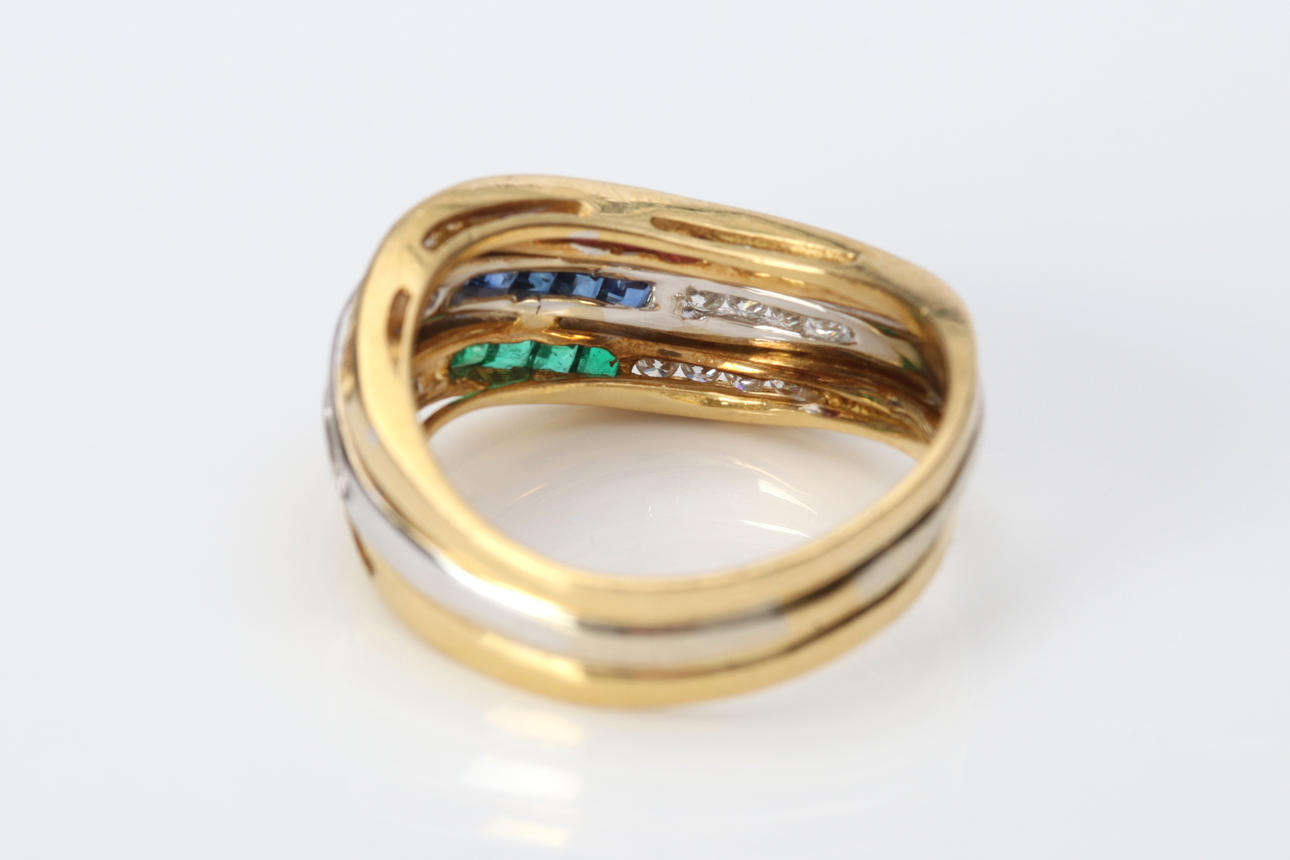 Ring 18k with diamonds, rubies, sapphires and emeralds, size approx. 18 mm, total weight 6.6 g.