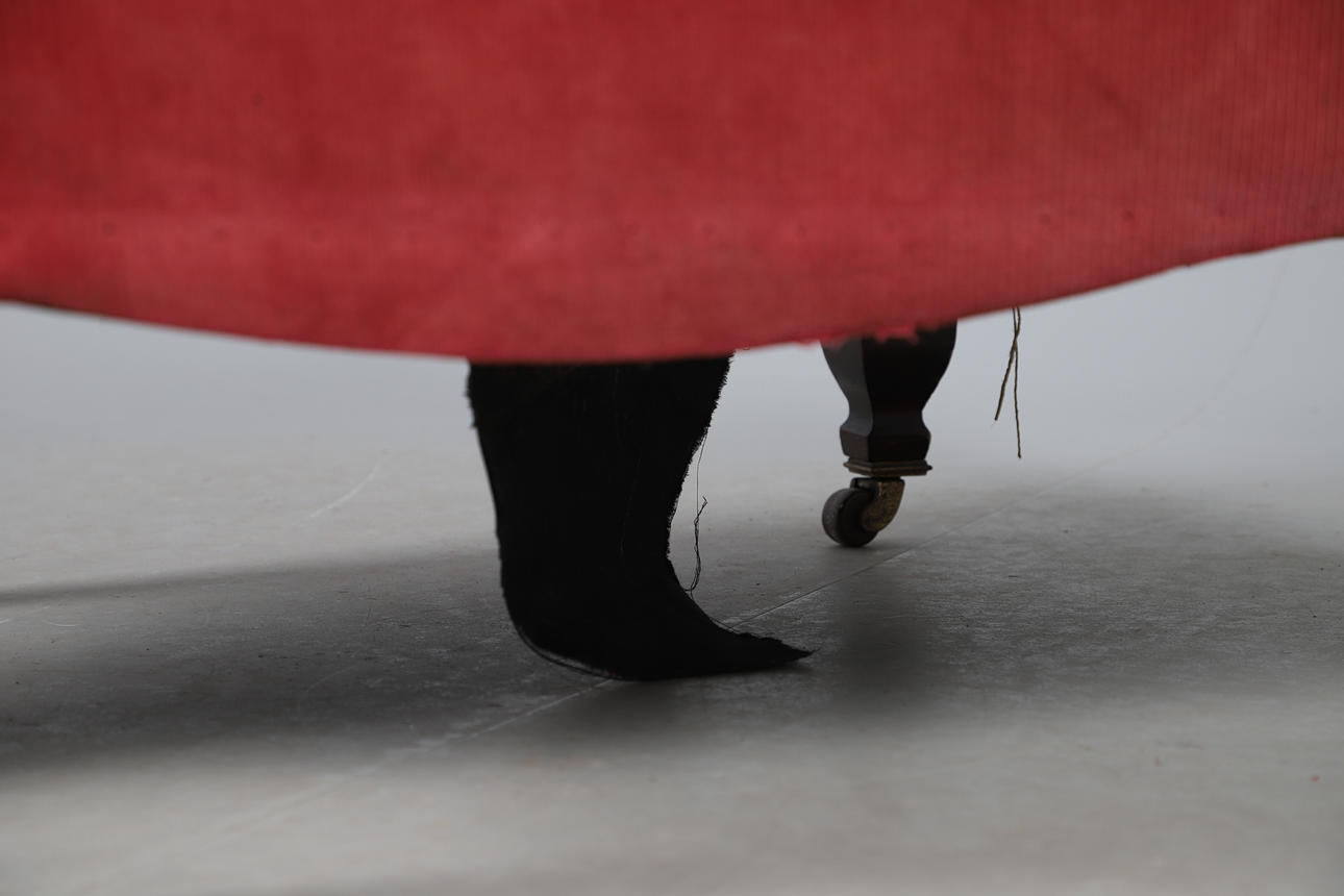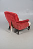 With red corduroy upholstery, seat missing cover, raised on wooden supports on casters. W69 x H90 x D70, seat H36cm.