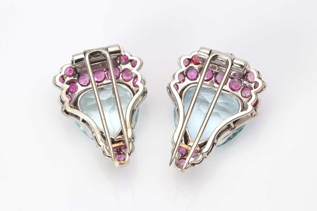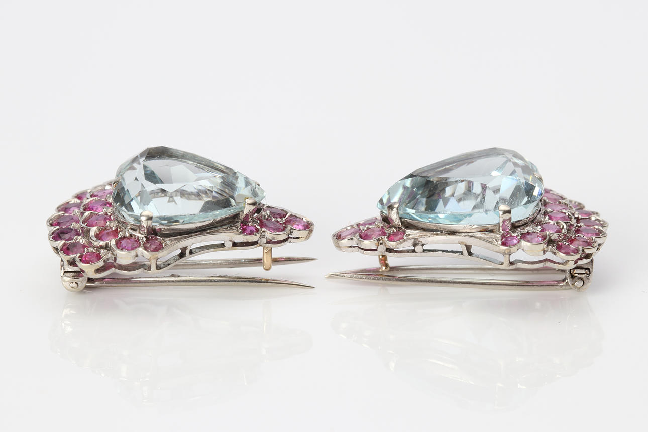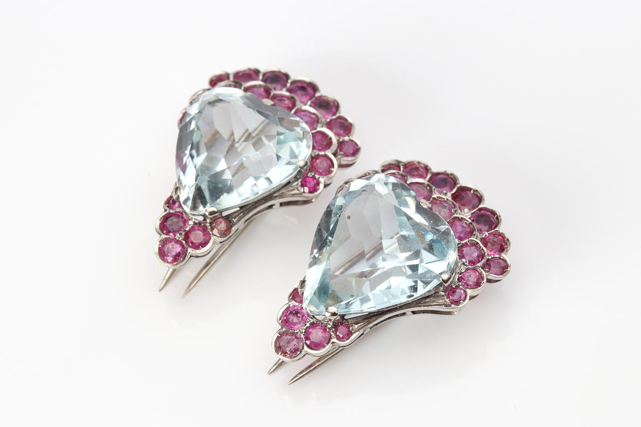 A pair of brooches in 18k white gold with heart-shaped aquamarines approx. 20 x 15 mm in light blue color and high clarity as well as faceted rubies, total weight 16.5 g.