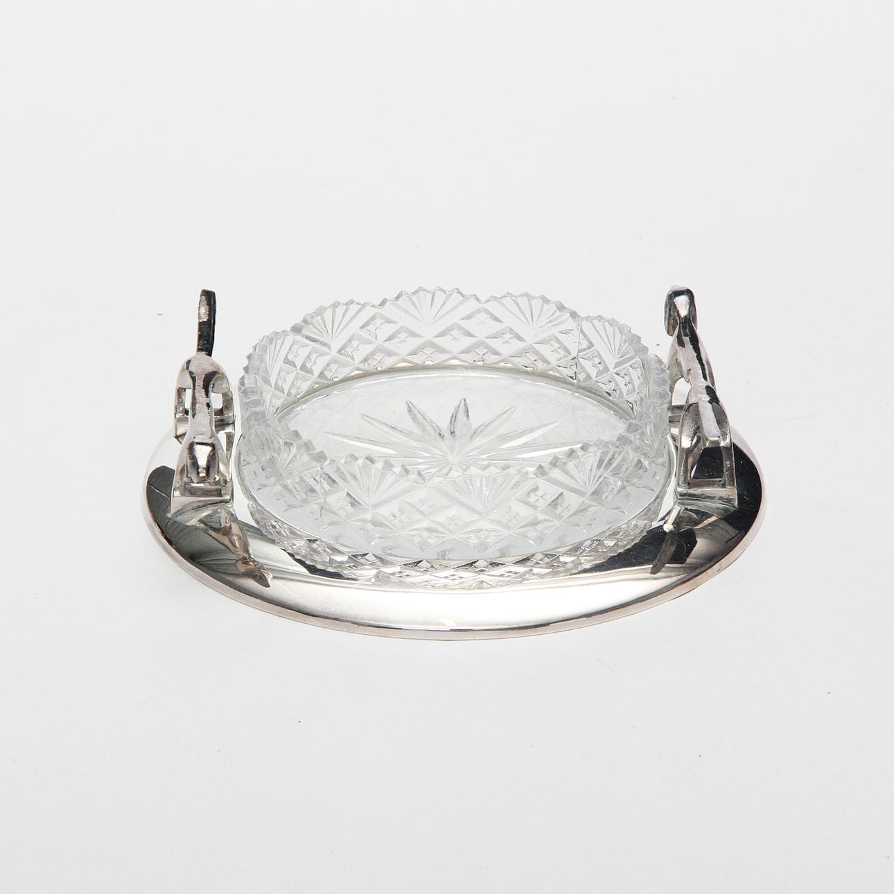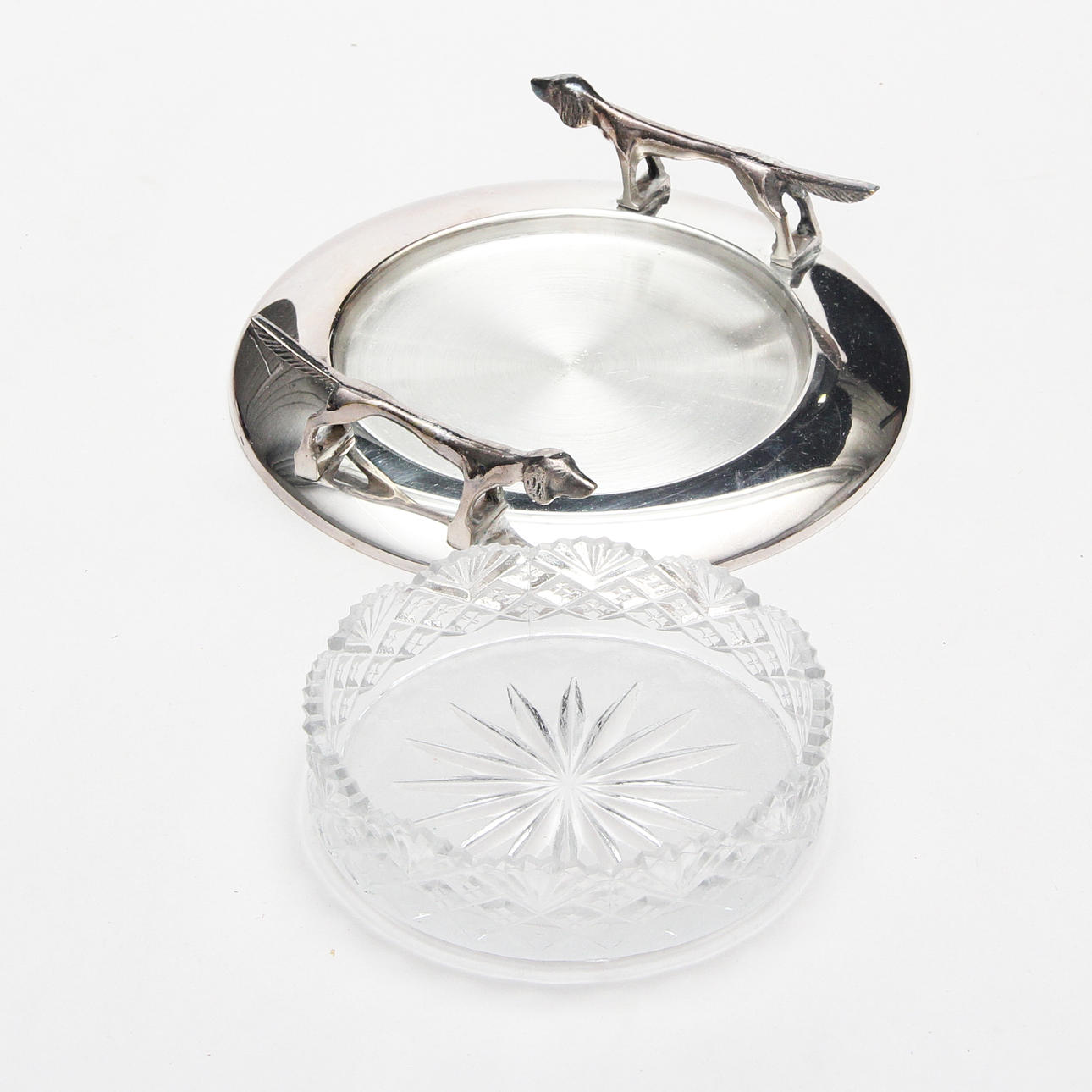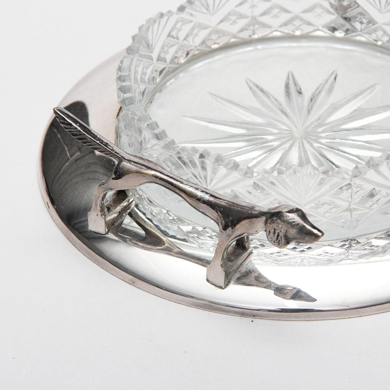 5028893. SERVING DISH, with dogs, silver plate/glass.