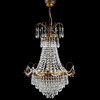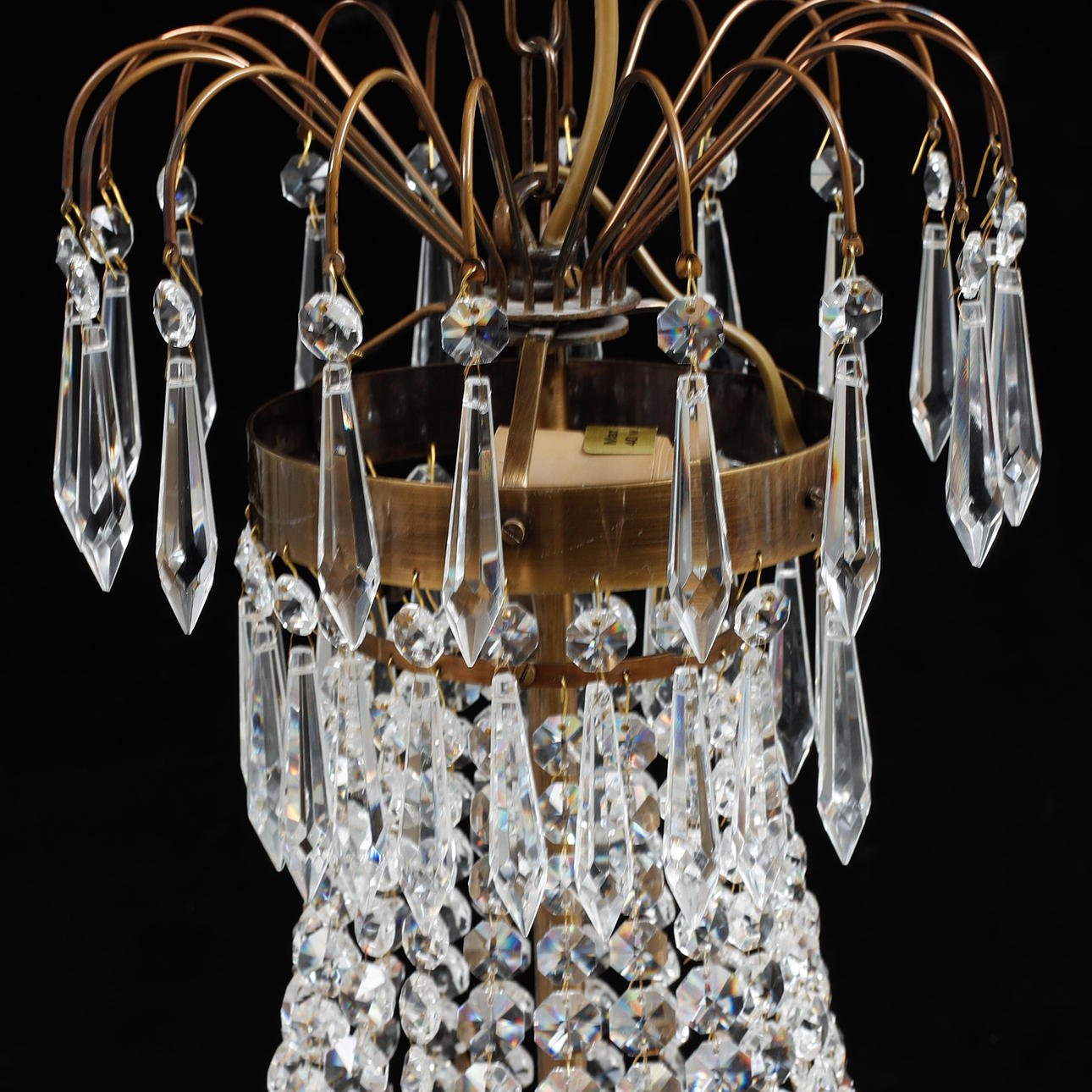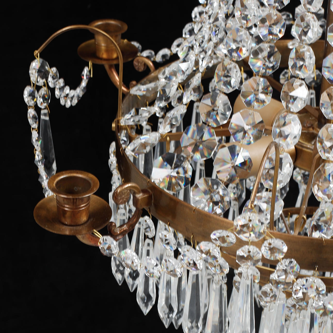 Gilt metal hung with variously cut glass. Five light arms. Diameter approx. 45 cm, height approx. 64 cm.