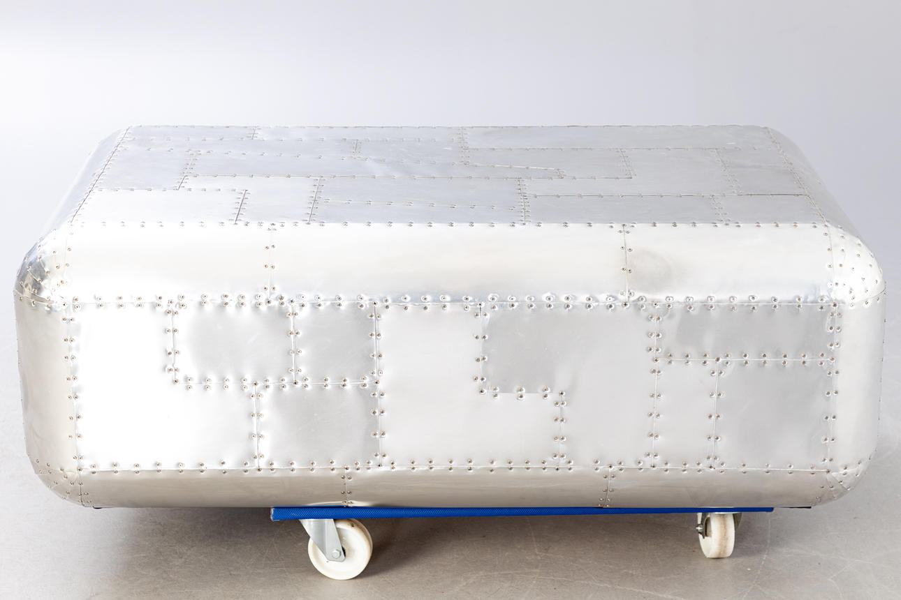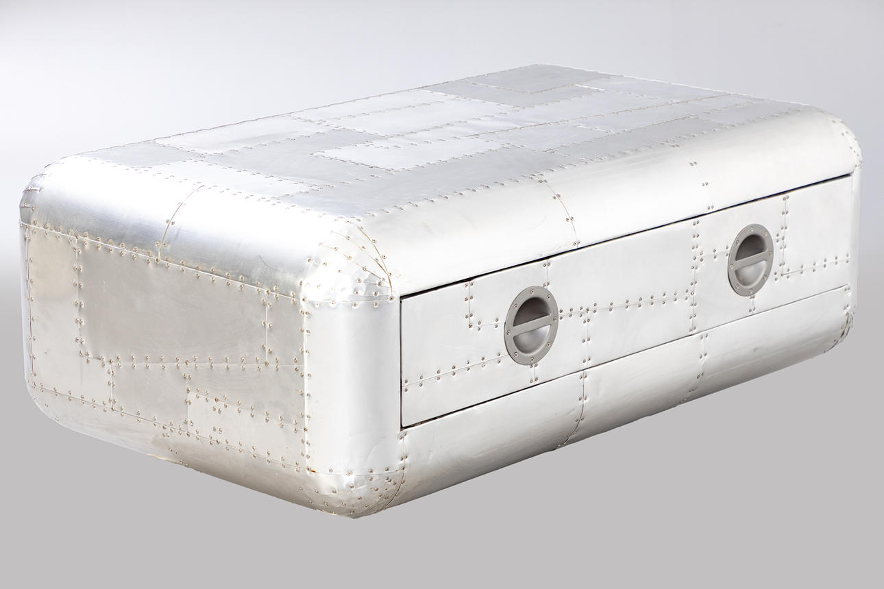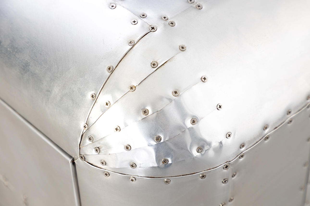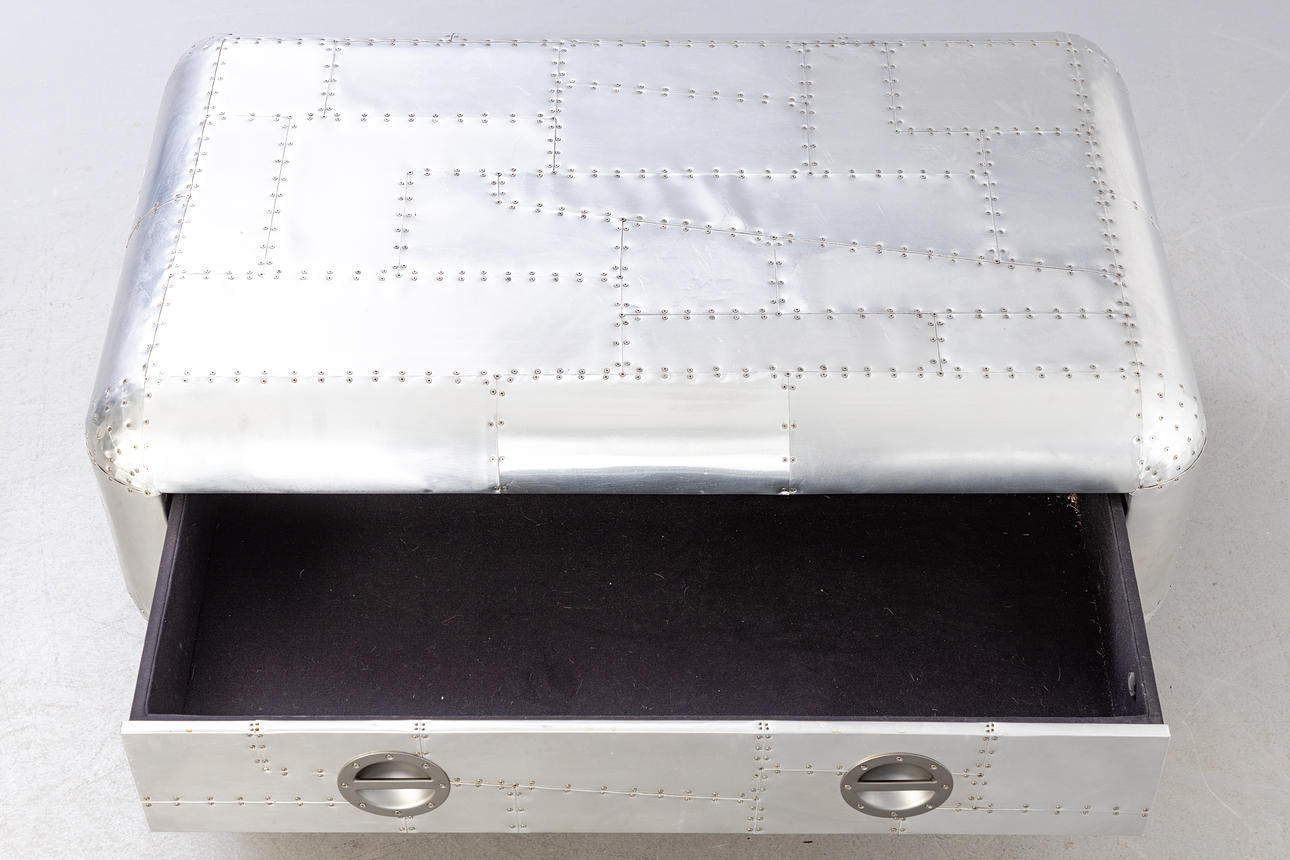 Construction made of wood with a surface of riveted aluminium plates. One drawer with black fabric interior. approx. H. 46 cm x W 130 cm x D 80 cm.