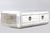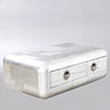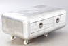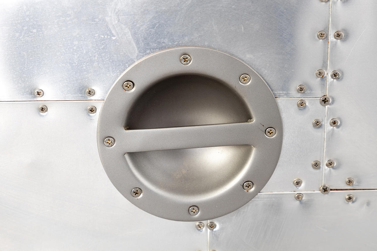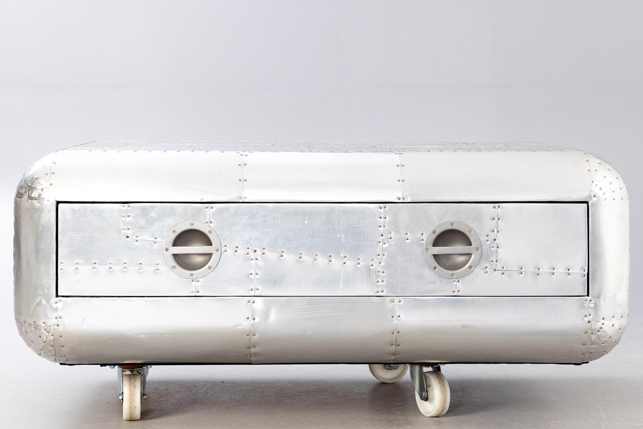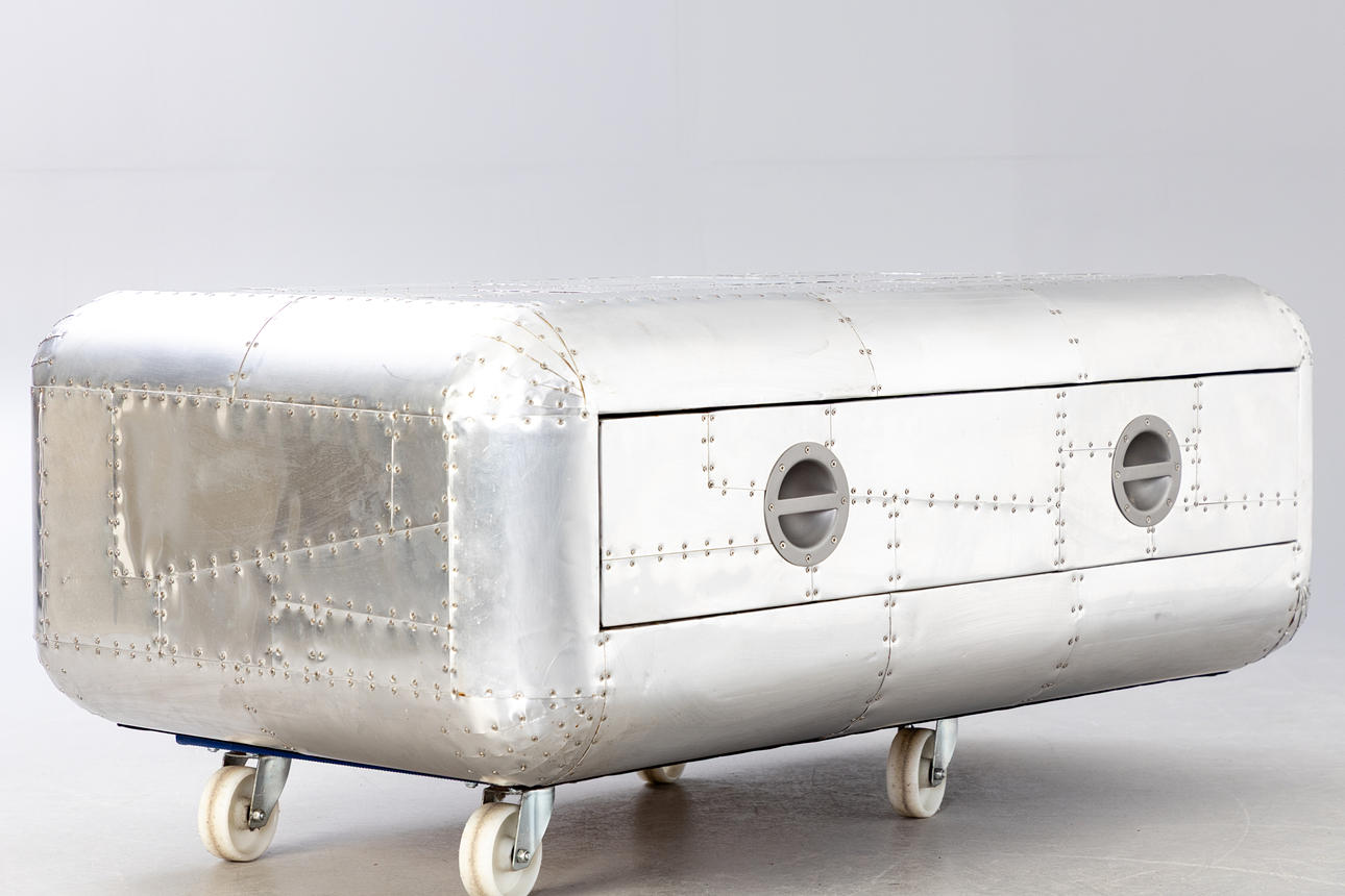 Construction made of wood with a surface of riveted aluminium plates. One drawer with black fabric interior. approx. H. 46 cm x W 130 cm x D 80 cm.