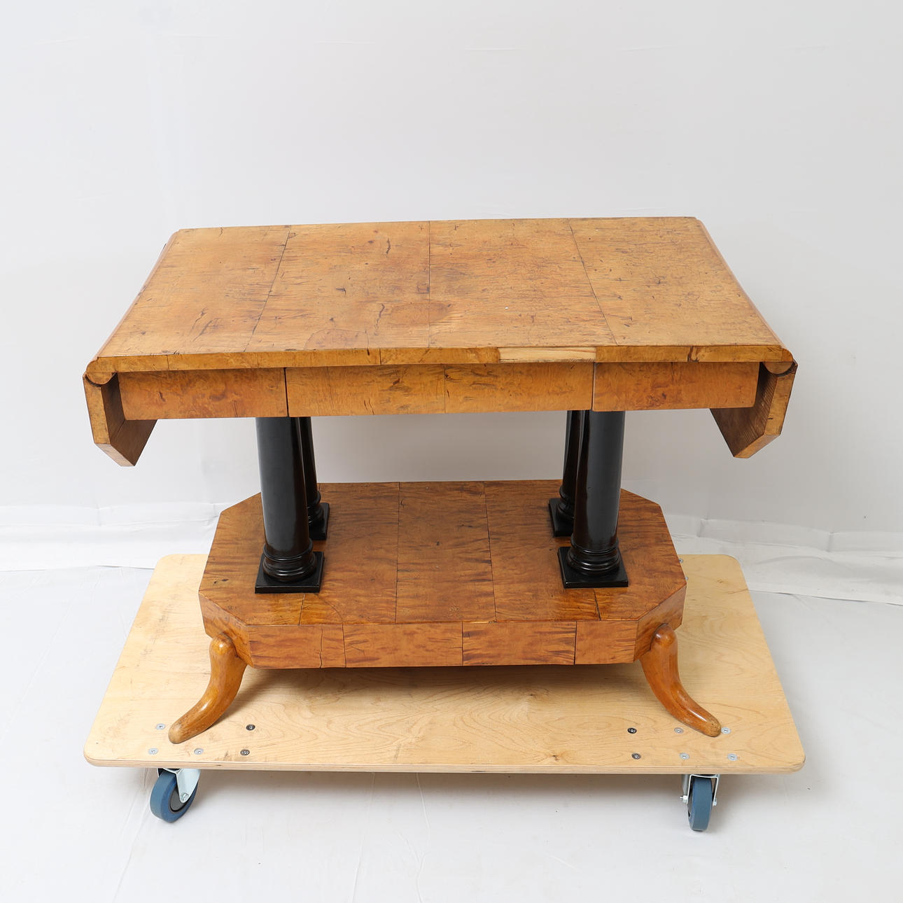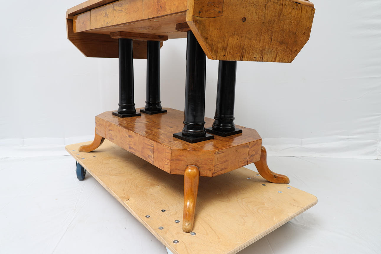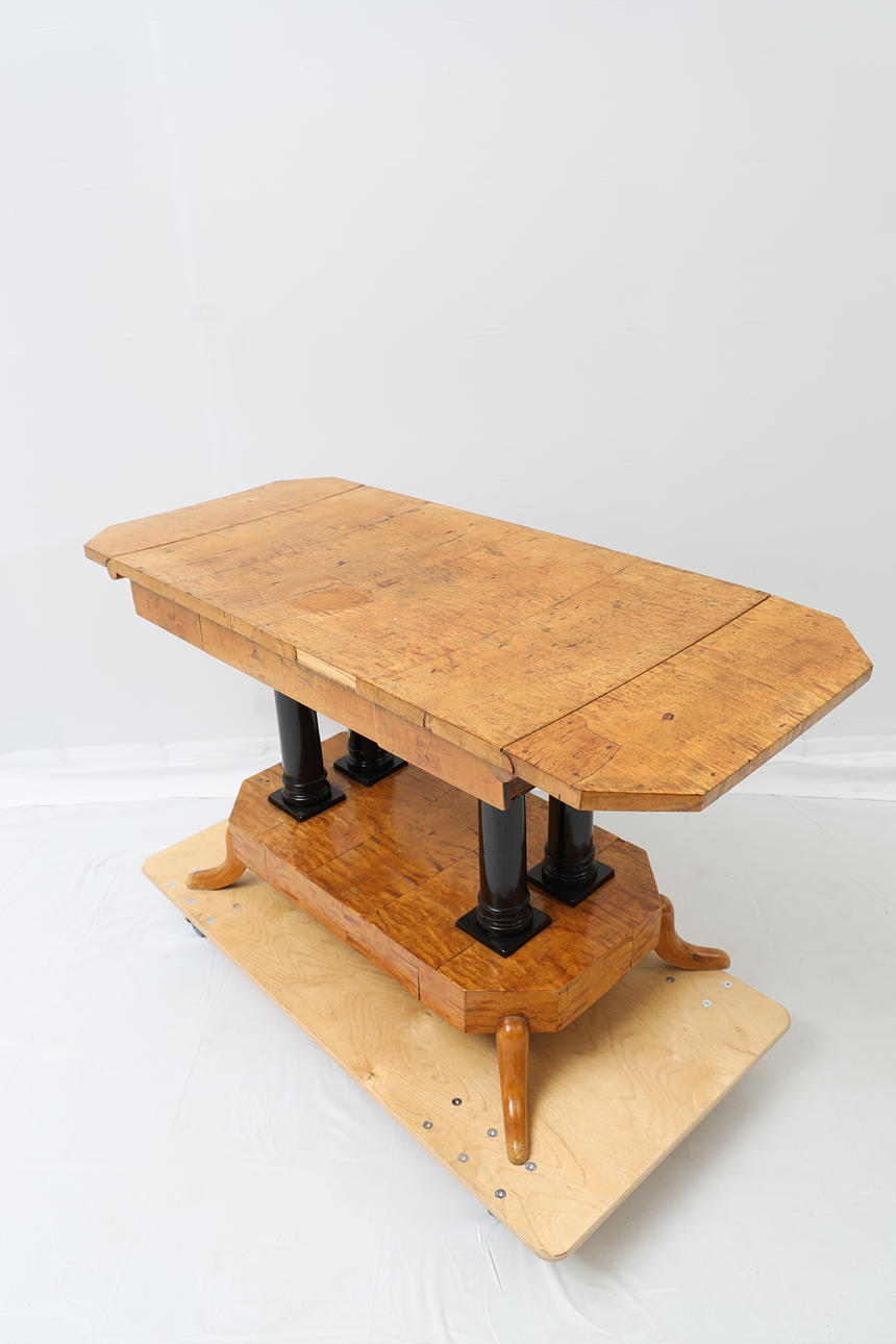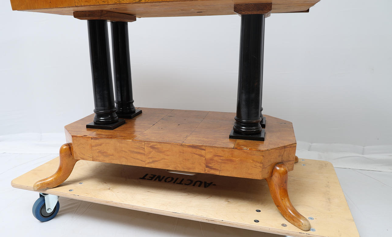 Veneered with birch burl. Turned ebonized columns. Apron with three drawers on each side.