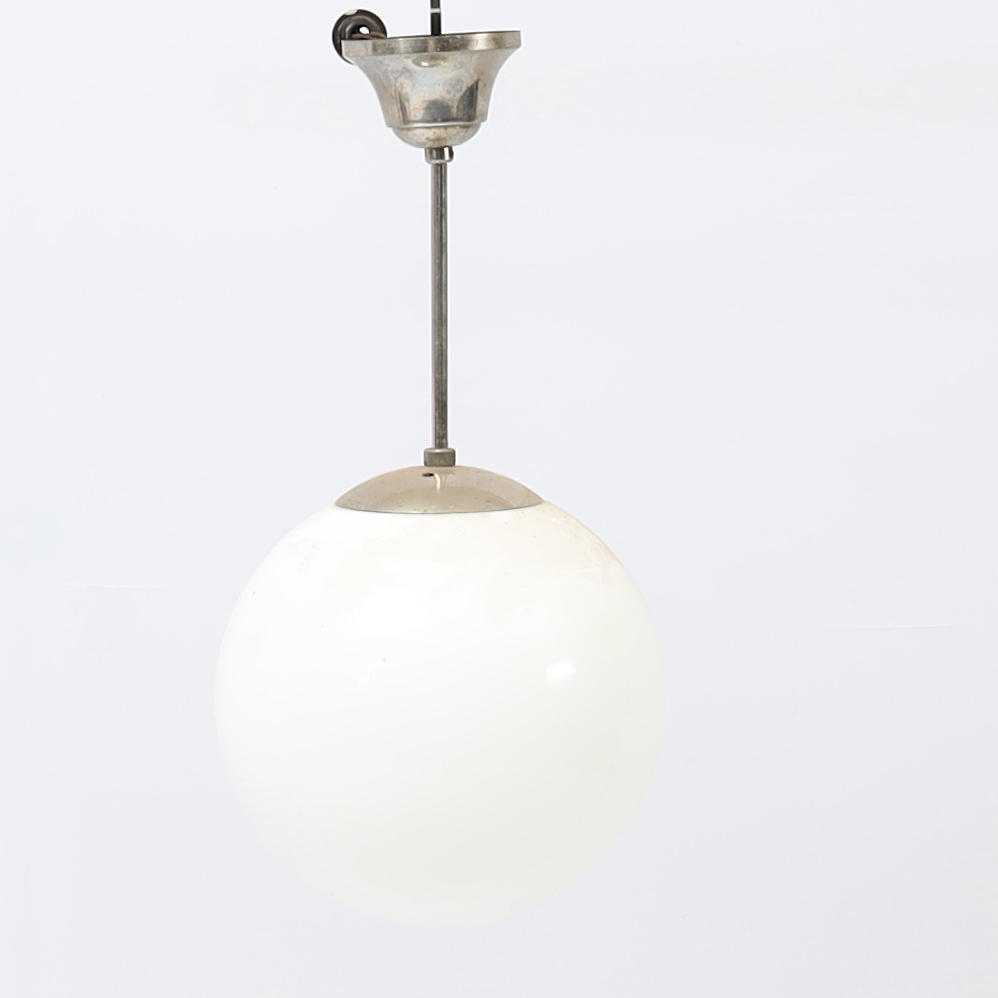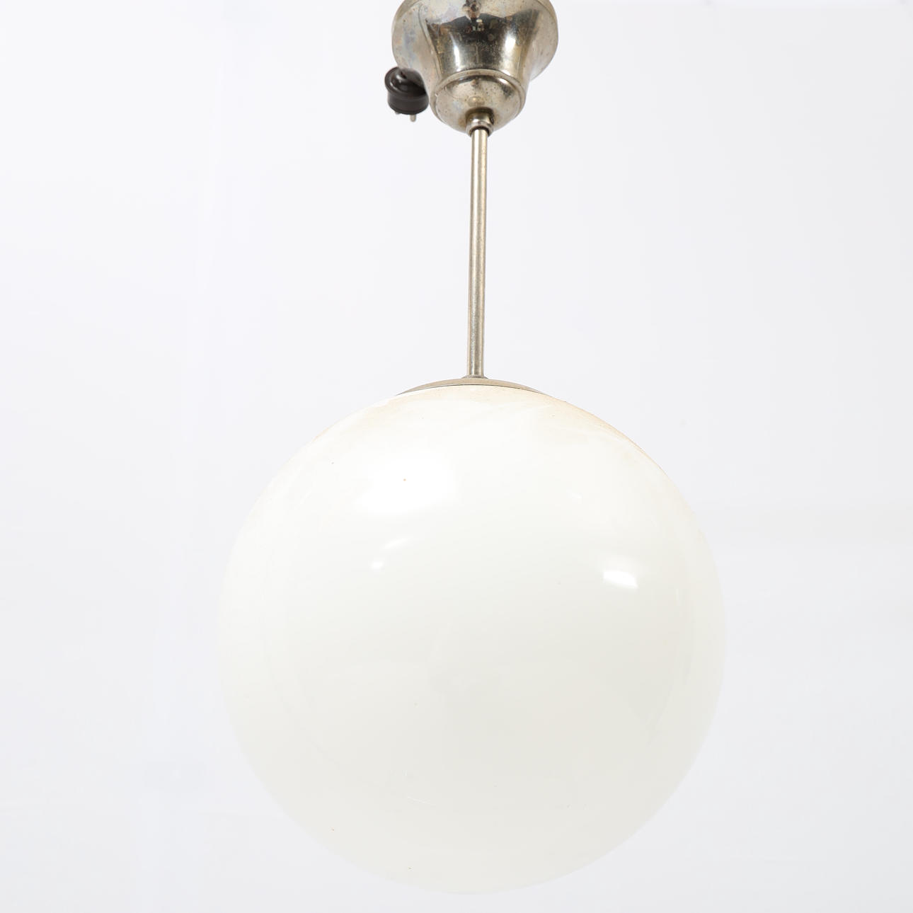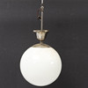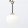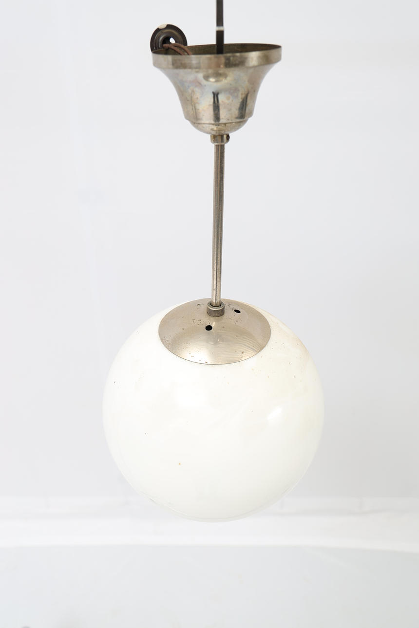 Spherical shade of white-toned glass. Mount in nickel-plated metal.
