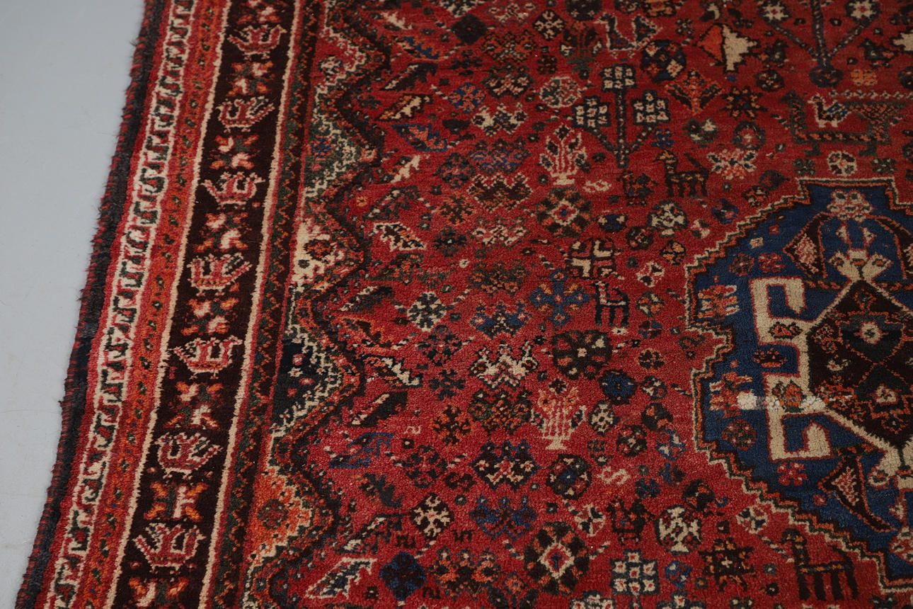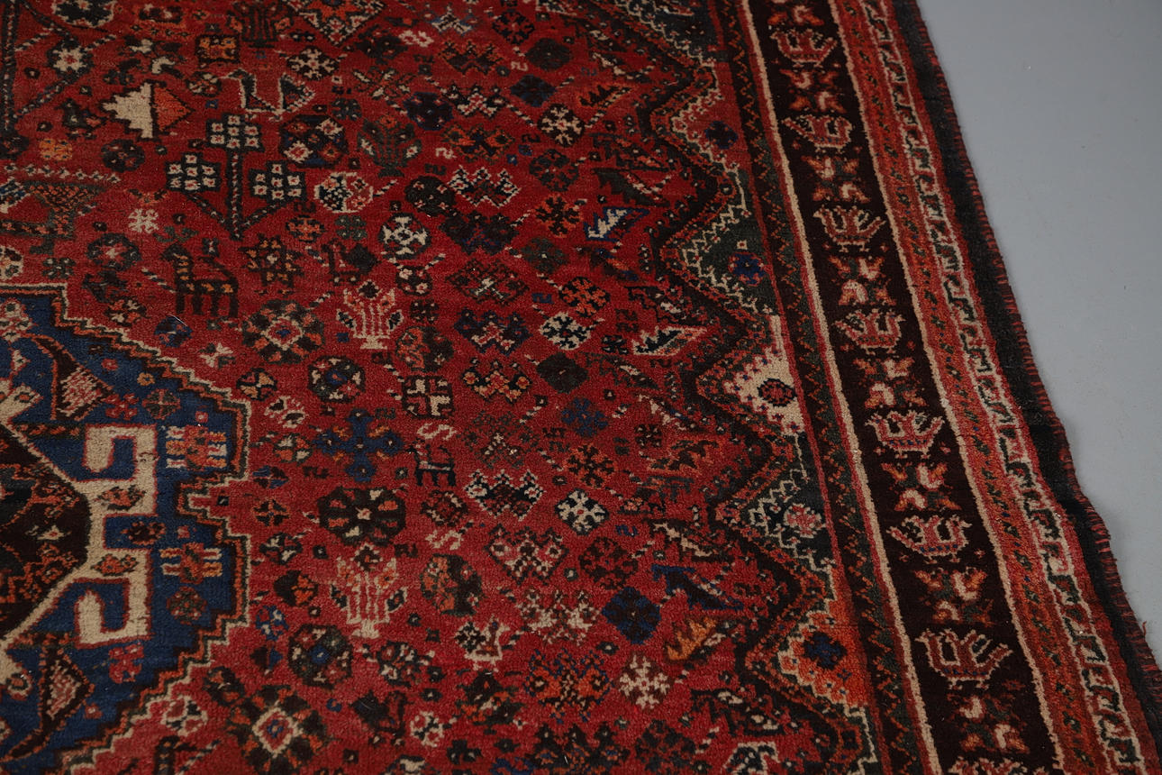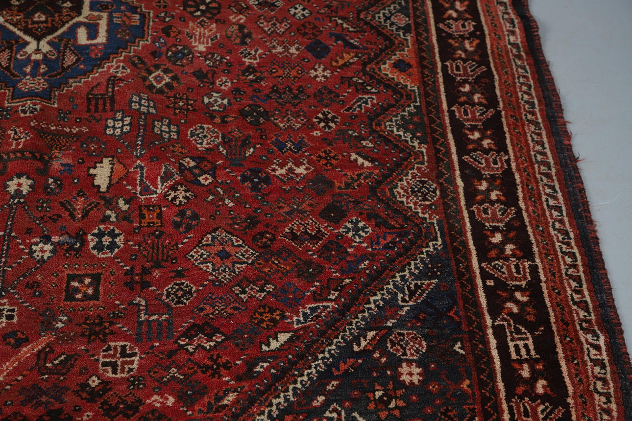 the raspberry field with tribal and floral motifs centred by an indigo panel framed by spandrels and narrow borders of zoomorphic devices, 269 x 169cm.