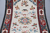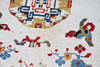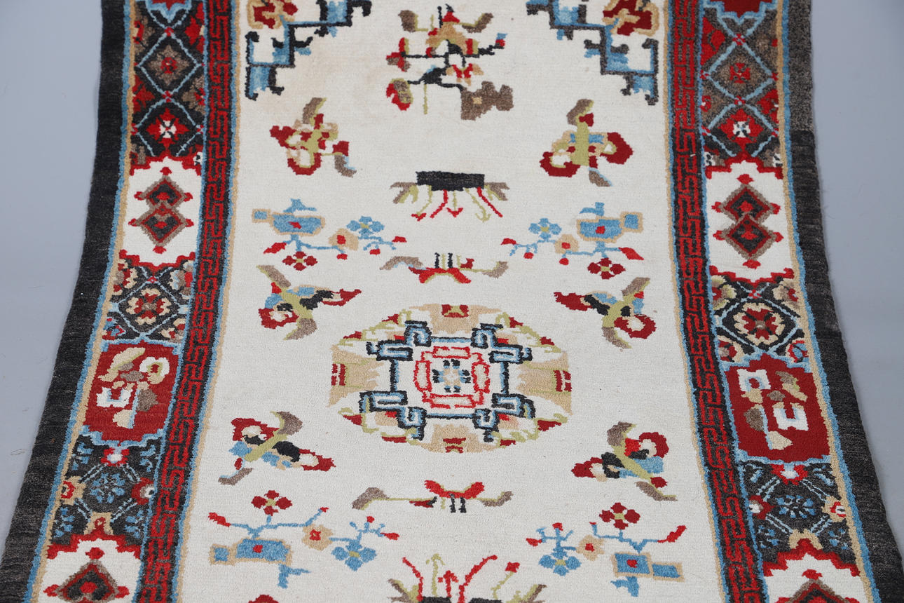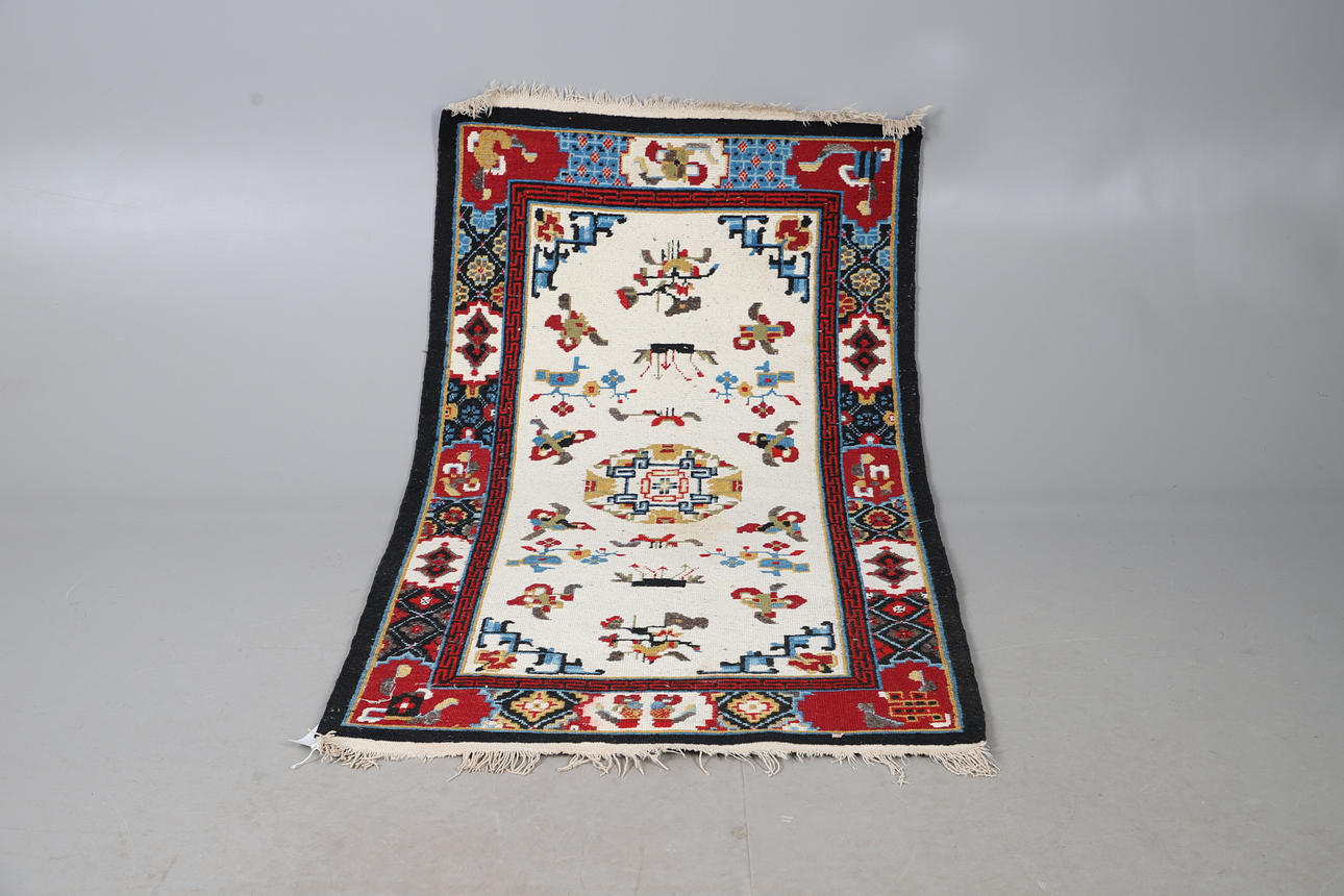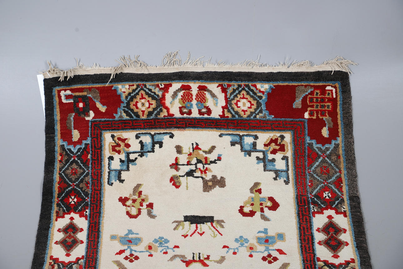 The ivory field with central roundel surrounded by Taoist motifs enclosed by cartouche borders, 157 x 89cm.