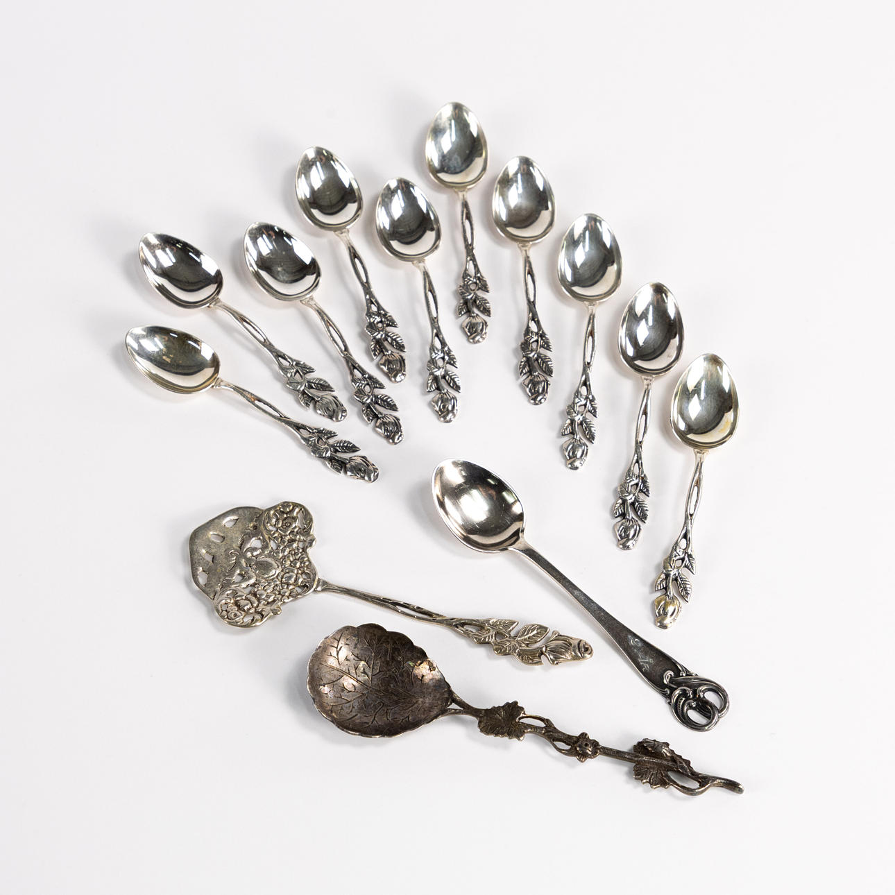 SPOONS. 13 pcs, silver, mostly demitasse spoons.