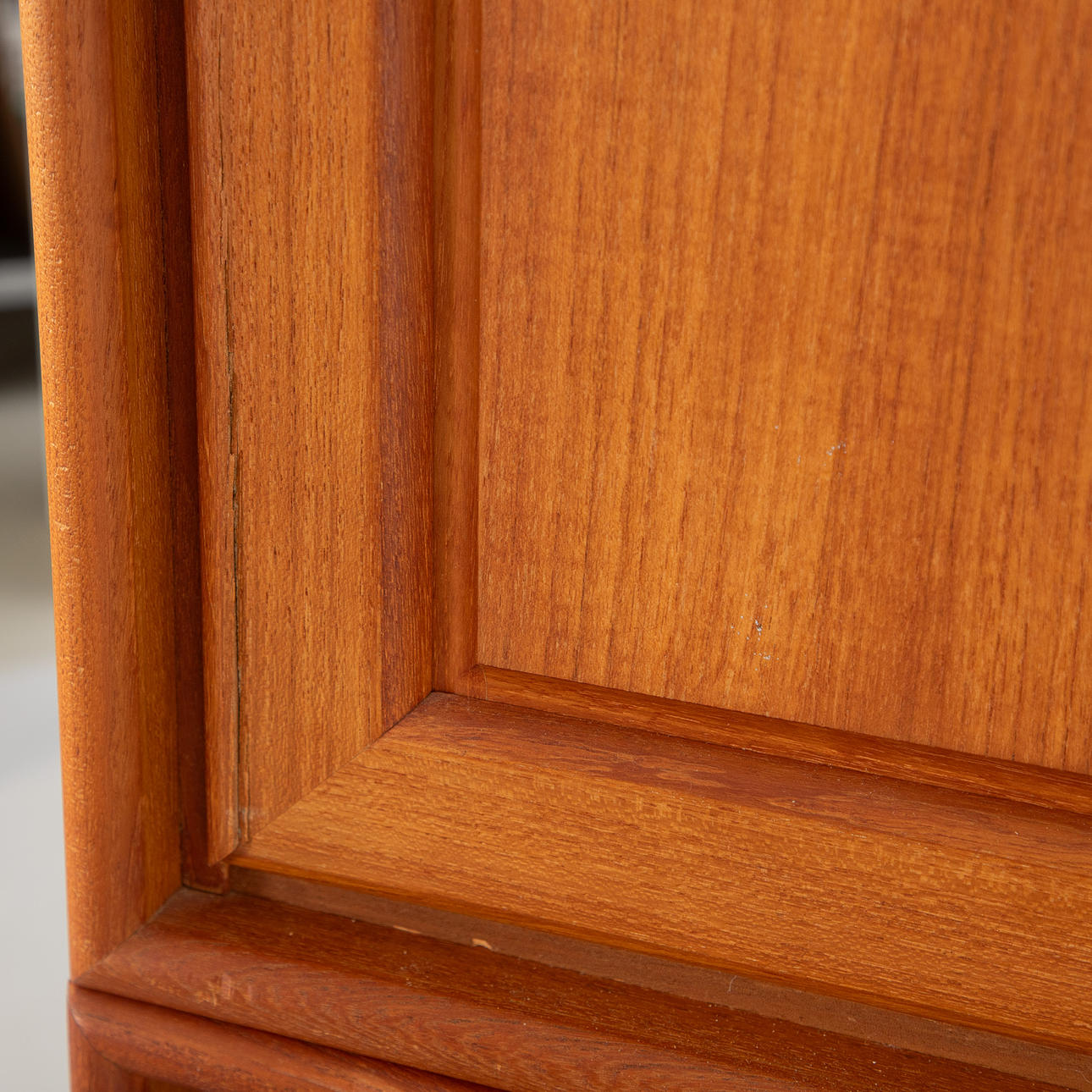 Signs of age and use. Break to the molding of the drop-down door. Hole in the back panel.
