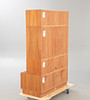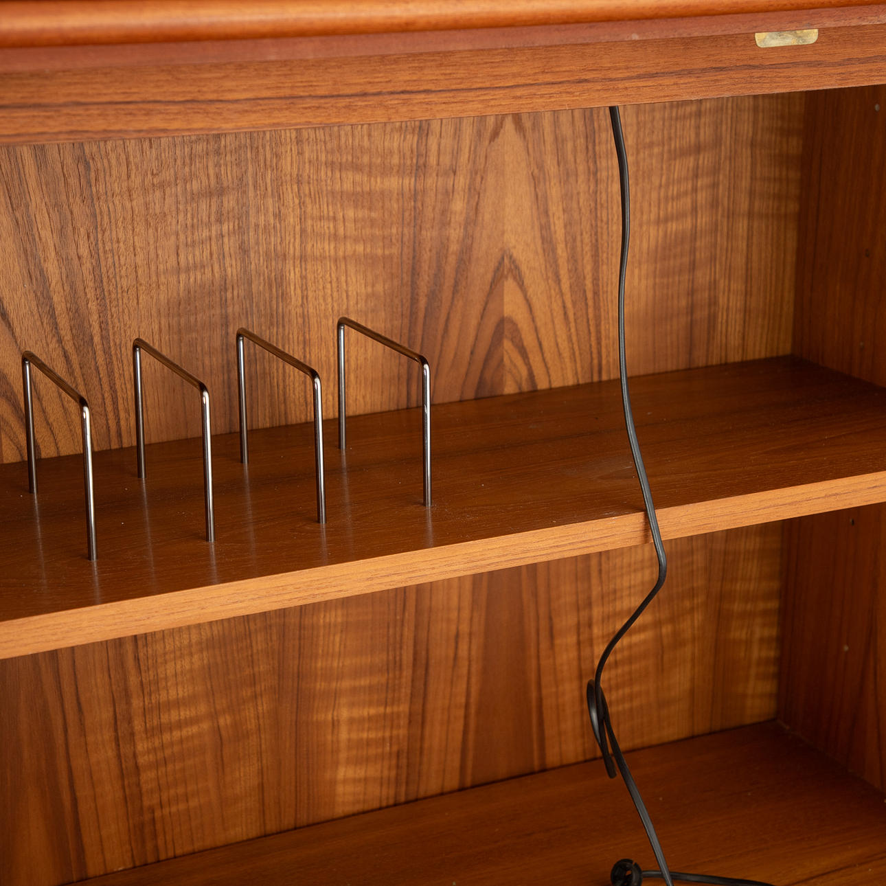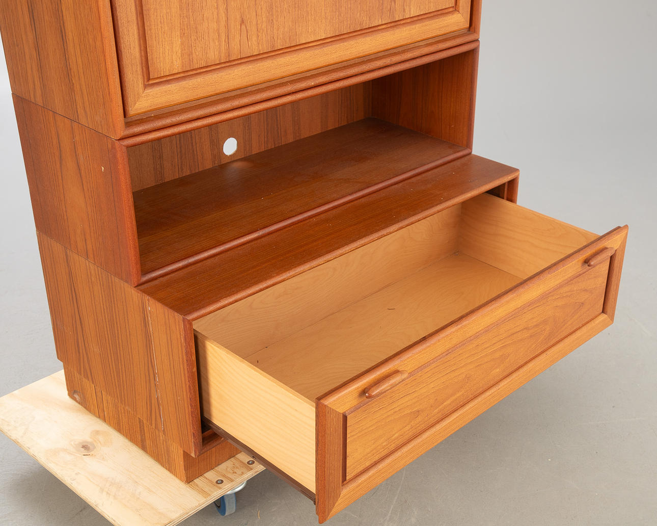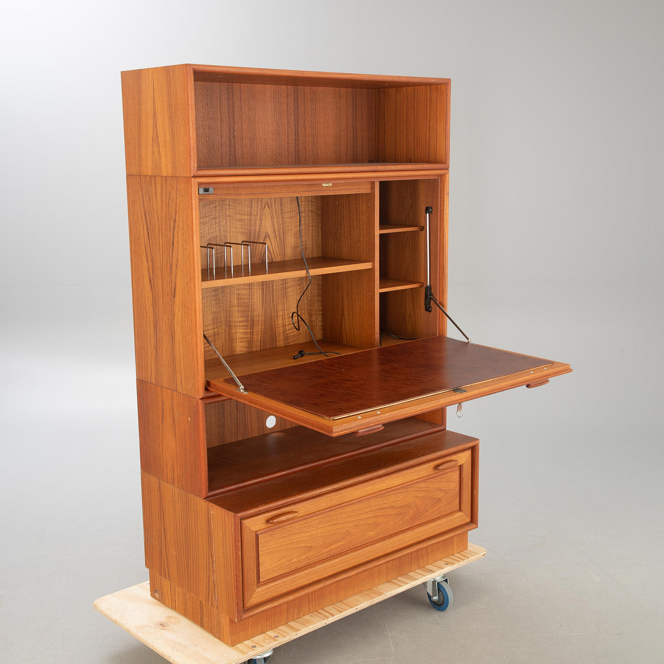 Teak veneer. 4 pieces, including among others: A cabinet body with lock, drop-down writing surface, covered in leather, interior with compartments and lamp with cable. A cabinet body with one drawer.